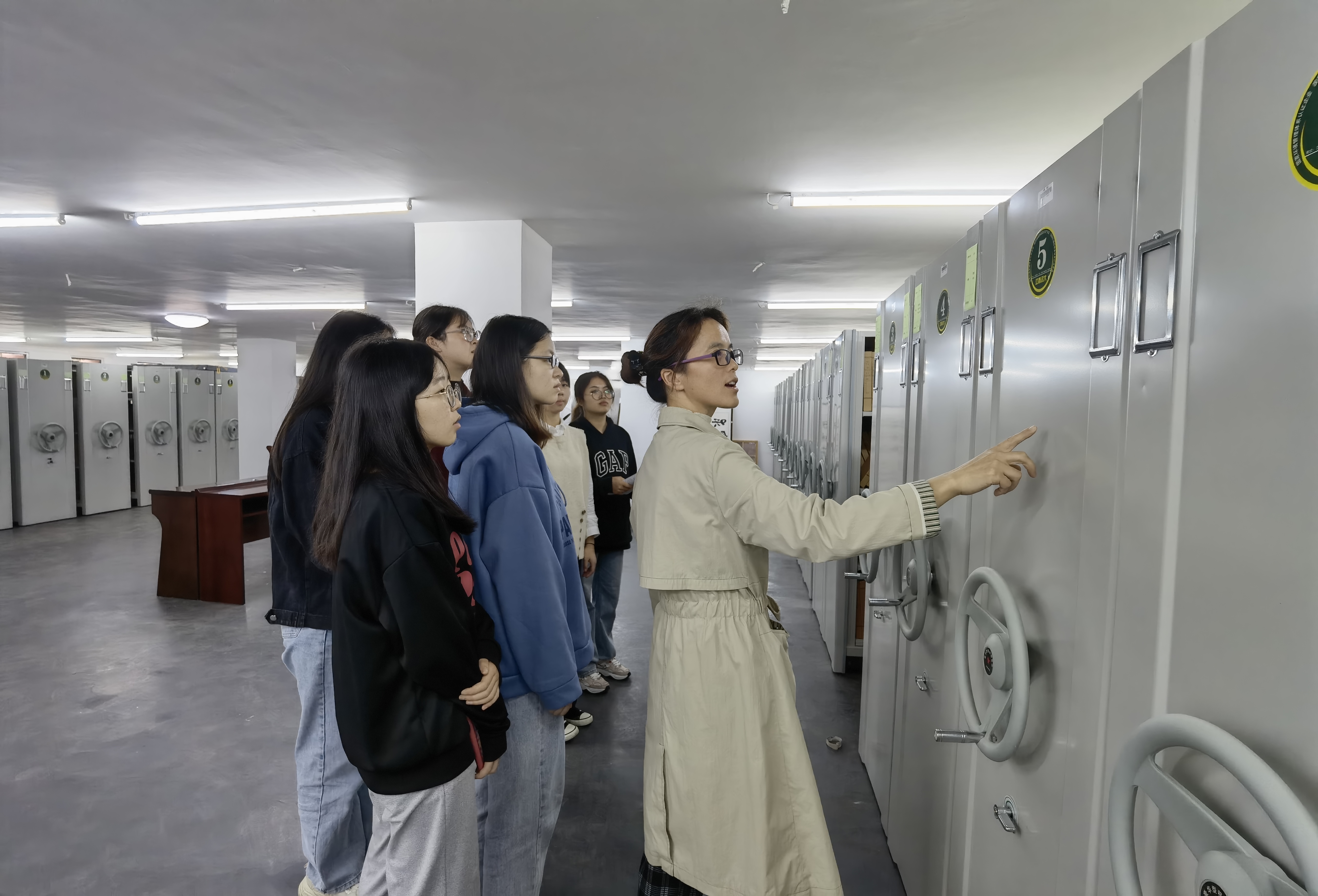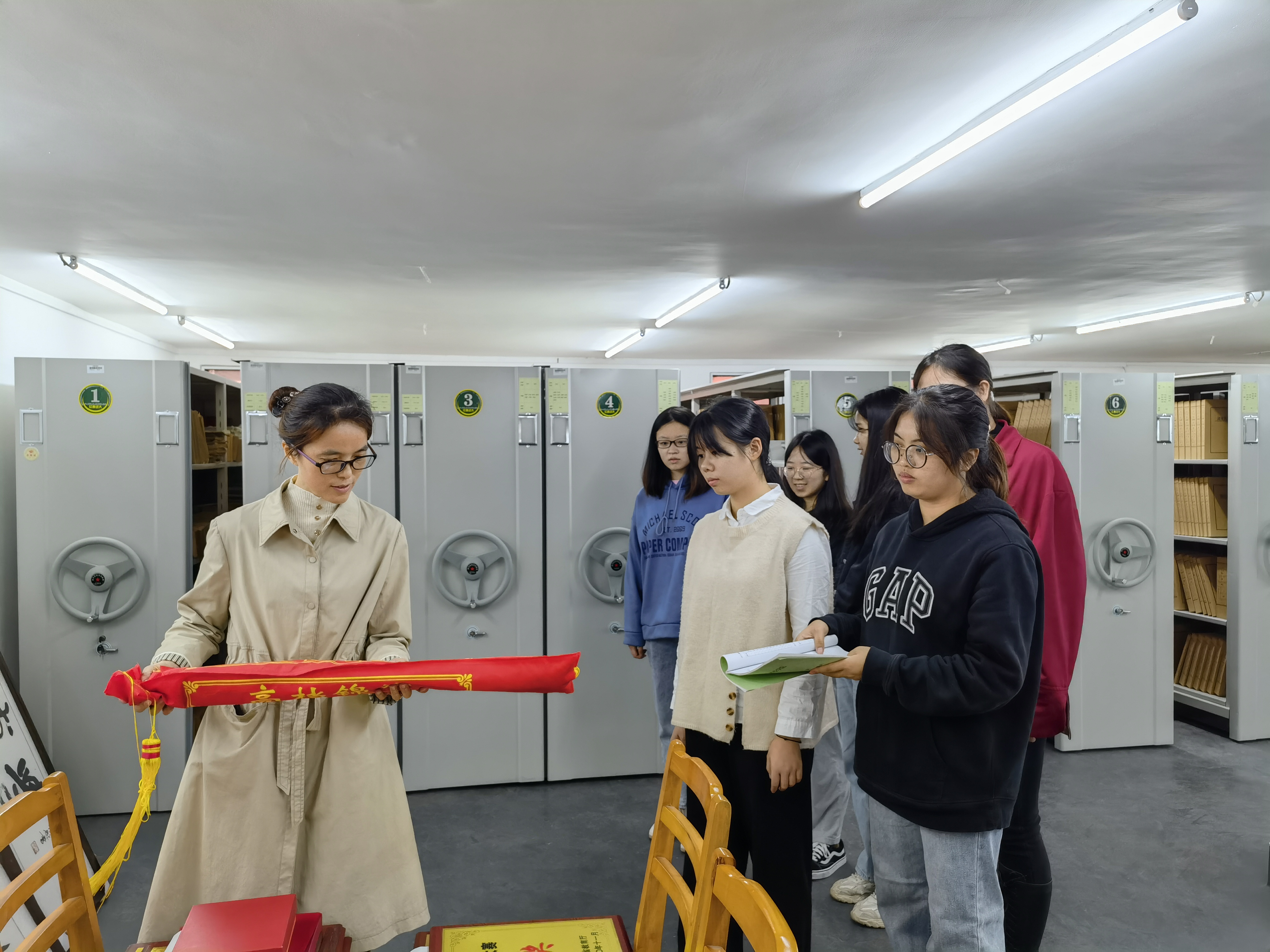 文书综合档案管理员廖利香为同学们示范文书档案的排架和检索方法以及实物档案的分类整理。