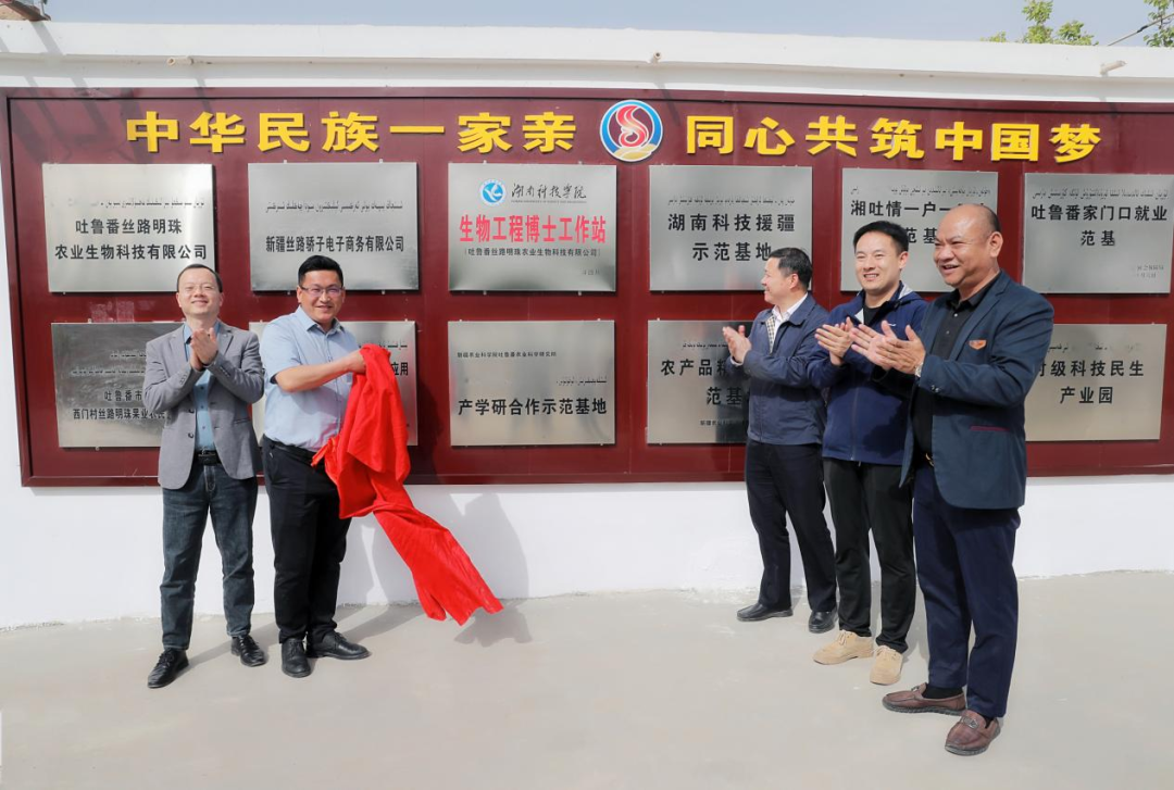 活动现场,湖南省人民政府副秘书长、援疆前方指挥部指挥长、吐鲁番市委副书记刘中杰,湖南省援疆前方指挥部副指挥长、吐鲁番市委组织部副部长、示范区党委副书记林亮亮与304am永利集团官网谢建伟博士、吐鲁番丝路明珠农业生物科技有限公司总经理王永旭及湖南吻野现代农业科技有限公司总经理罗令松共同为“304am永利集团官网生物工程博士工作站”揭牌。