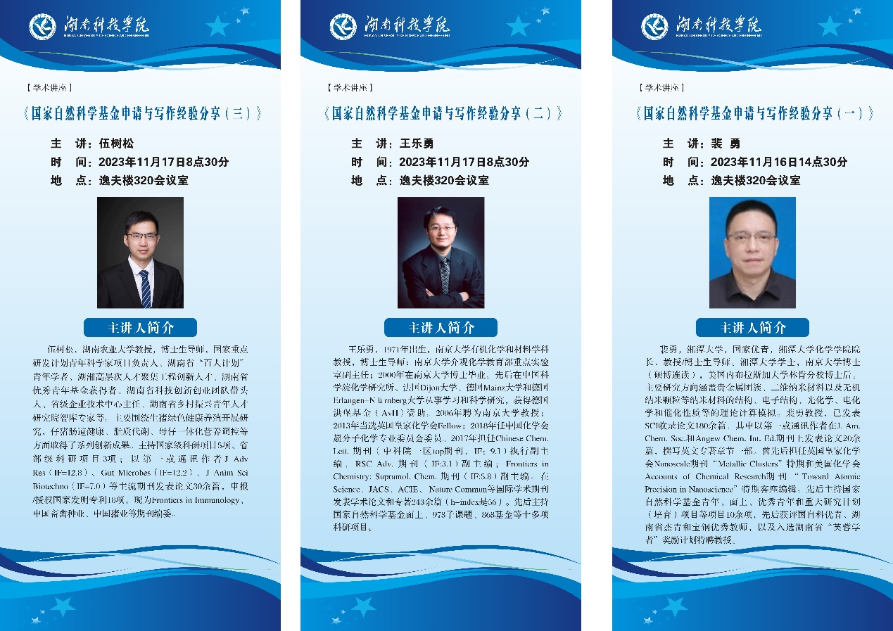 (本网讯 袁志辉)11月16日-17日,湘潭大学裴勇教授、南京大学王乐勇教授、湖南农业大学伍树松教授、湖南农业大学潘浪教授、湖南农业大学吴德志教授、湘潭大学汪璞和马忠云副教授等有成功申报和主持多项国家自然科学基金面上、青年项目的专家学者受邀来永利官网做国家自然科学基金申请经验分享与交流报告。