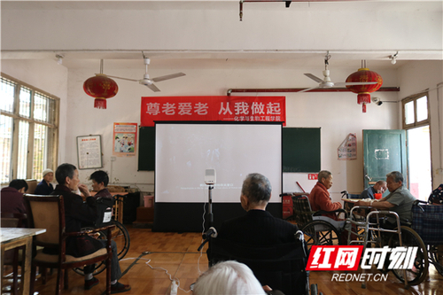 志愿者们与老人们一起观看了红色电影《血战湘江》《金刚川》,电影中扣人心弦的情节、宏大的战争场面让大家目不转睛,影片也将大家带回那段峥嵘岁月。老人蒋老满激动地说:“没有共产党就没有我们安享的晚年,感谢共产党,感谢国家,愿我们伟大的祖国越来越强大、人民越来越幸福。”