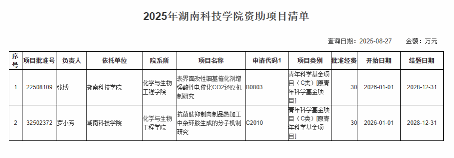 8月27日,国家自然科学基金委员会公布了2025年度国家自然科学基金项目评审结果。我院申报的项目获佳绩:张博、罗小芳2位博士均获批国家自然科学基金青年科学基金项目(C类)资助,资助总经费60万元。