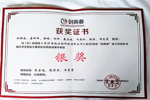 11月3日,由共青团中央、教育部、人力资源和社会保障部、中国科协、全国学联、浙江省政府主办,浙江大学、浙江团省委承办的2018年“创青春”浙大双创杯全国大学生创业大赛决赛落下帷幕。经过多轮比拼,永利官网由王宗成、赵荣生、王志堂老师指导,孙锡南、冯美玲等同学的作品《长沙至诚生物科技有限公司》喜获创业实践赛银奖,湖南省在此次大赛中斩获2金9银33铜,永利官网成为全省夺银的两所二本院校之一。