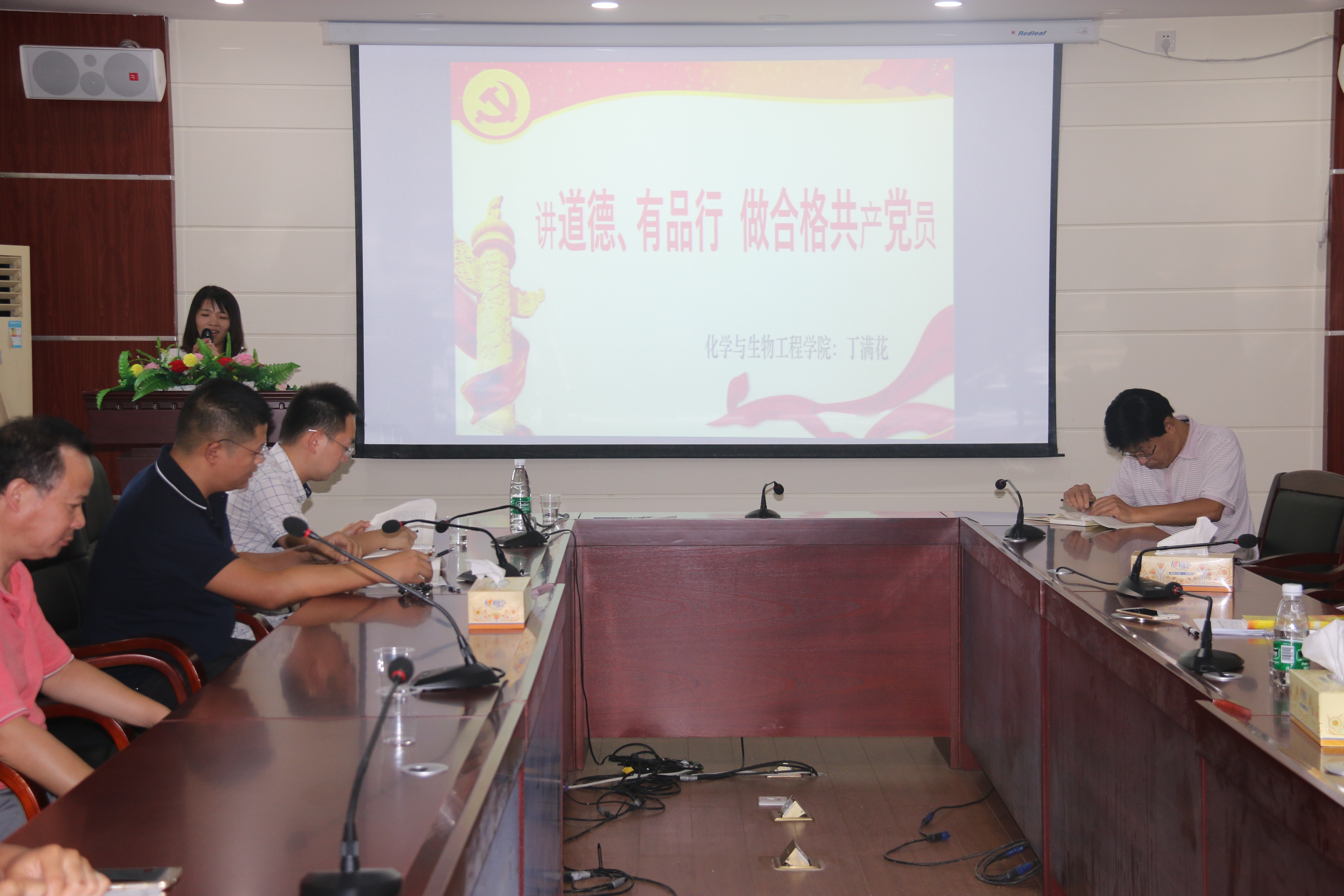本网讯(通讯员 邓平洋)9月2日下午,化生院师生党员在逸夫楼320会议室参加“两学一做”第三专题集中学习,学院总支纪检委员丁满花和组织委员饶赟为全体党员上党课。
