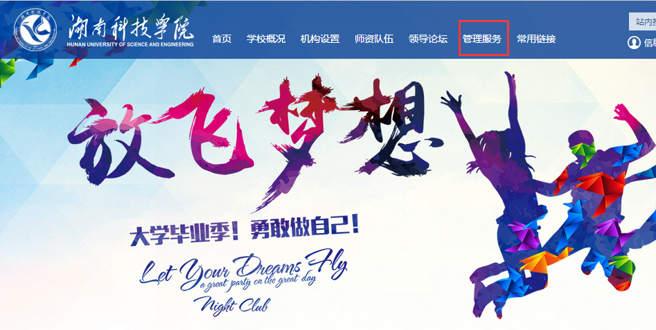 一、登录教务管理系统:网址:http://jw.huse.cn:81, 或者进入学校主页,依次选择“管理服务-教务管理”。教务管理系统用户名即本人“学号”,默认密码为“学号”,已改密码但忘记的请到本人所在学院教务办主任处咨询。