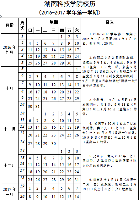 304am永利集团官网校历 (2016-2017学年第一学期)