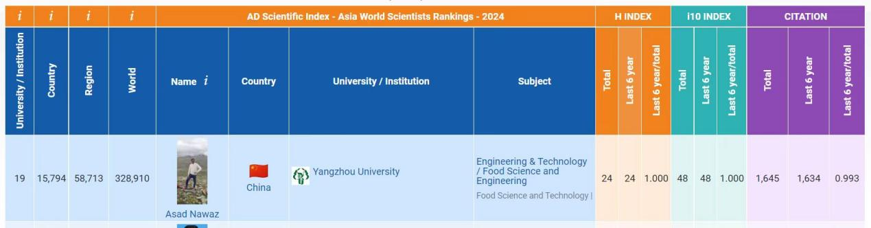 AD Scientific Index 2024发布最新排名,永利官网Asad Nawaz博士入选亚洲工程技术领域科学家排名,在中国排名15794位,亚洲地区58713位,全球328910位,H指数24,I10指数48,论文总引用数1645。全球前2%顶尖科学家榜单由斯坦福大学John P.A. Ioannidis教授团队与国际权威学术出版社Elsevier合作的项目成果,发布在Elsevier旗下的Mendeley Data网站上。榜单基于Scopus数据库的引用数据系统分析,对全球约700万科学家的论文引用数(区分自引和他引,提供自引数据)、H指数、合著者调整的HM因子、单独或第一作者的文章引用数等参数进行综合考量,涵盖文、理、工学科,收录来自22个学科领域、176个子学科领域全球排名前2%的科学家,能够更客观、更真实地反映科学家的产出量和学术影响力,为科学家长期科研表现提供了一个衡量指标。