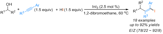 吴超博士以来源易得的芳香仲醇、炔烃和廉价的氢碘酸作为原料,以高收率的制备了结构多样性的烯基碘衍生物。该研究成果“Direct synthesis of alkenyl iodides via indium-catalyzed iodoalkylation of alkynes with alcohols and aqueous HI”以永利官网为唯一通讯单位发表在英国皇家学会Organic & Biomolecular Chemistry期刊(Org. Biomol. Chem., 2018,16, 3177,中科院化学大类二区)。