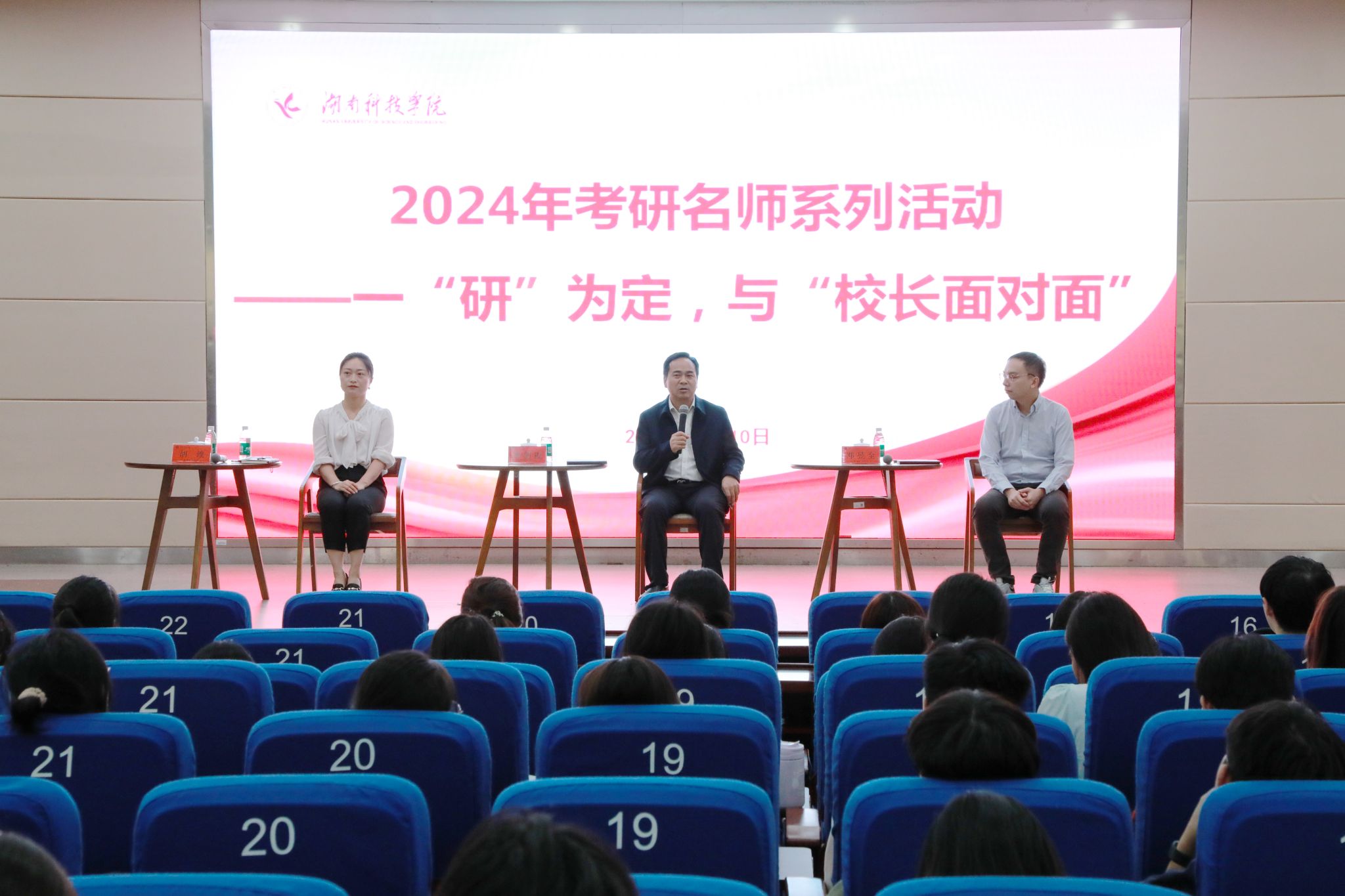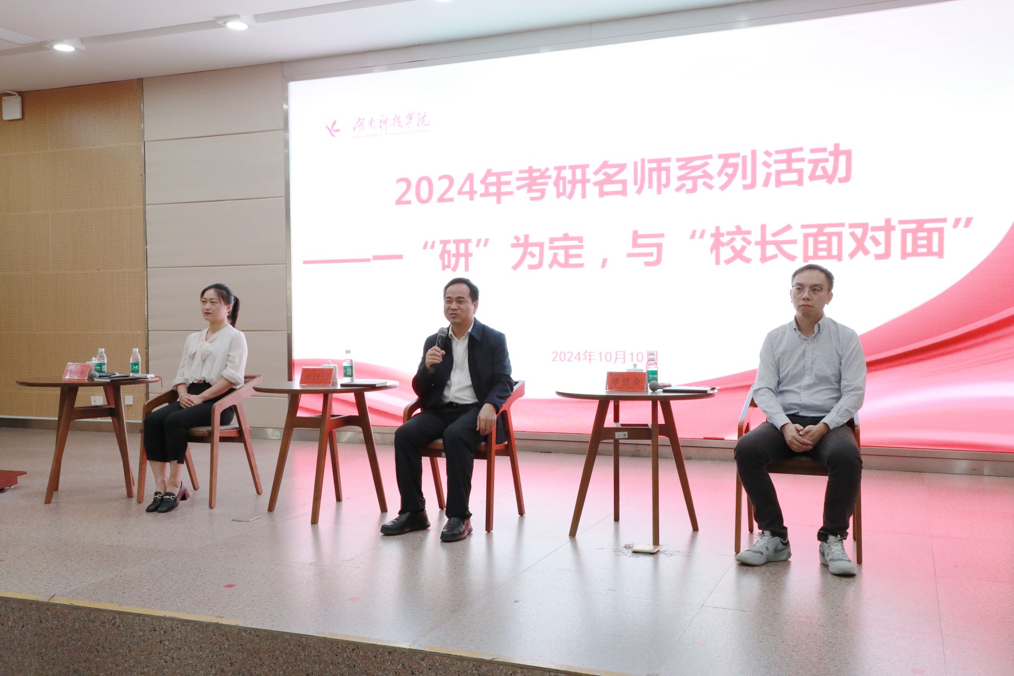 本网讯(通讯员 吕文青)10月10日,学校在潇湘大讲堂举行2024年考研名师系列——一“研”为定,与“校长面对面”活动。活动特邀学校党委副书记、校长黄创霞教授出席活动,还邀请外国语学院副院长胡维博士,马克思主义学院专任教师邓昱全博士参加活动,与学校2022级、2023级有考研意向的学生亲切交谈、分享经验。