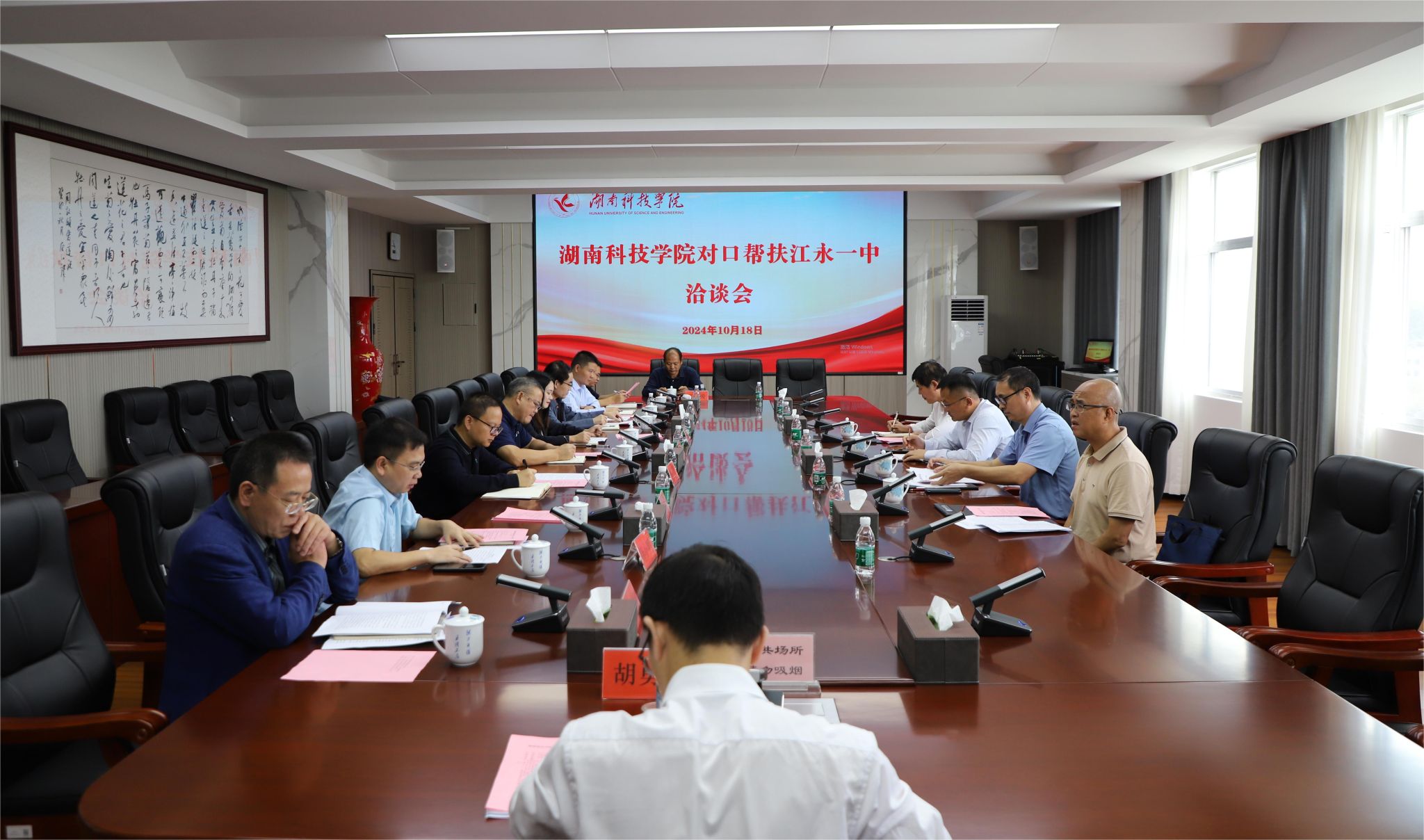 本网讯(记者 孙淑娴)10月18日,永利官网对口帮扶江永一中洽谈会在行政楼613会议室举行。校党委委员、副校长何福林、江永县人民政府副县长蒋剑平、江永县教育局局长黄野、江永县教育局总督学欧阳印权、江永一中校长蒲智全出席会议,相关人员及各学院主要负责人参加会议。会议由教务处处长张剑主持。