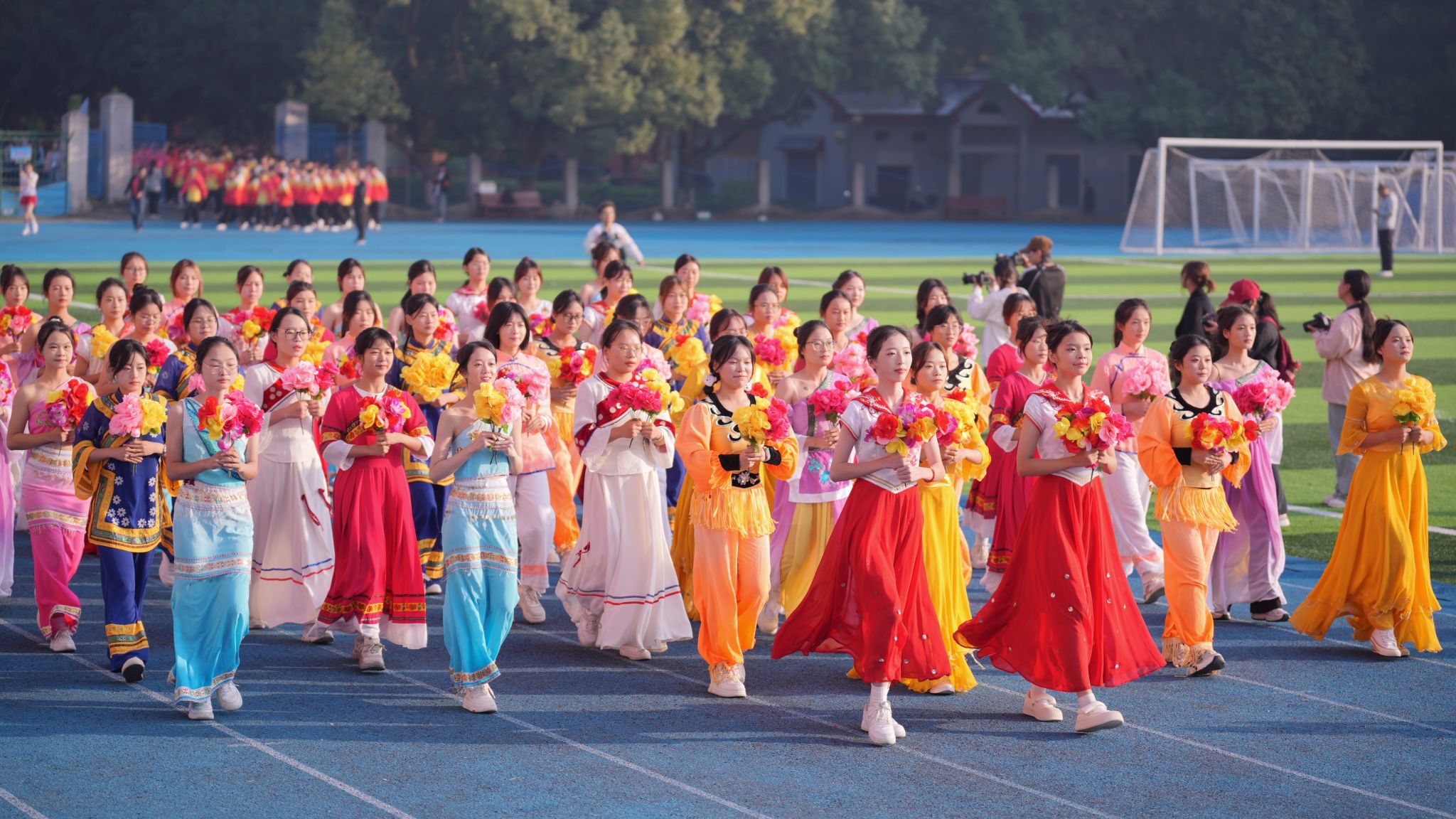 五颜六色的气球放飞天空,全场掌声雷动。在观众热情的欢呼声中,美术与艺术学院表演了啦啦操《我和我的祖国》,紫色的花球上下翻舞,她们以崭新的力量走出盛夏,展现出科院学子的无限活力;体育学院的健儿们在《武林风采》武术表演中大显身手,东安拳打出了气势,打出了对运动健儿们的支持与信心。