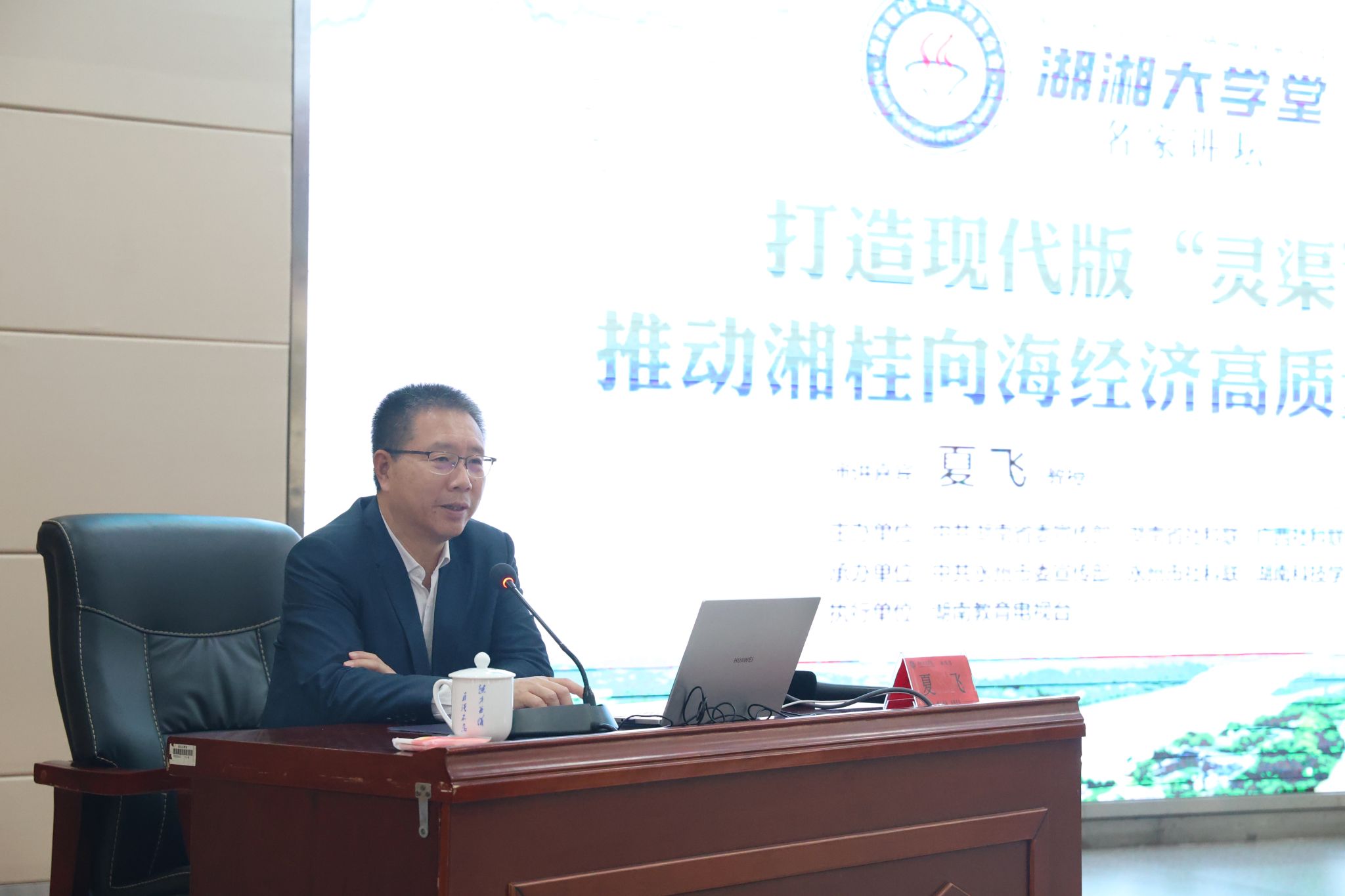 活动邀请了广西社科联兼职副主席、广西财经学院校长夏飞教授以《打造现代版“灵渠”推动湘桂向海经济高质量发展》为题作主旨宣讲,围绕打造现代版的“灵渠”、依托湘桂运河高水平建设西部陆海新通道等四个方面进行了深入解读,指出建设湘桂运河将极大提升内陆地区开放水平,推动形成陆海内外联动、东西双向互济的全方位开放格局,对于服务国家重大发展战略意义重大。