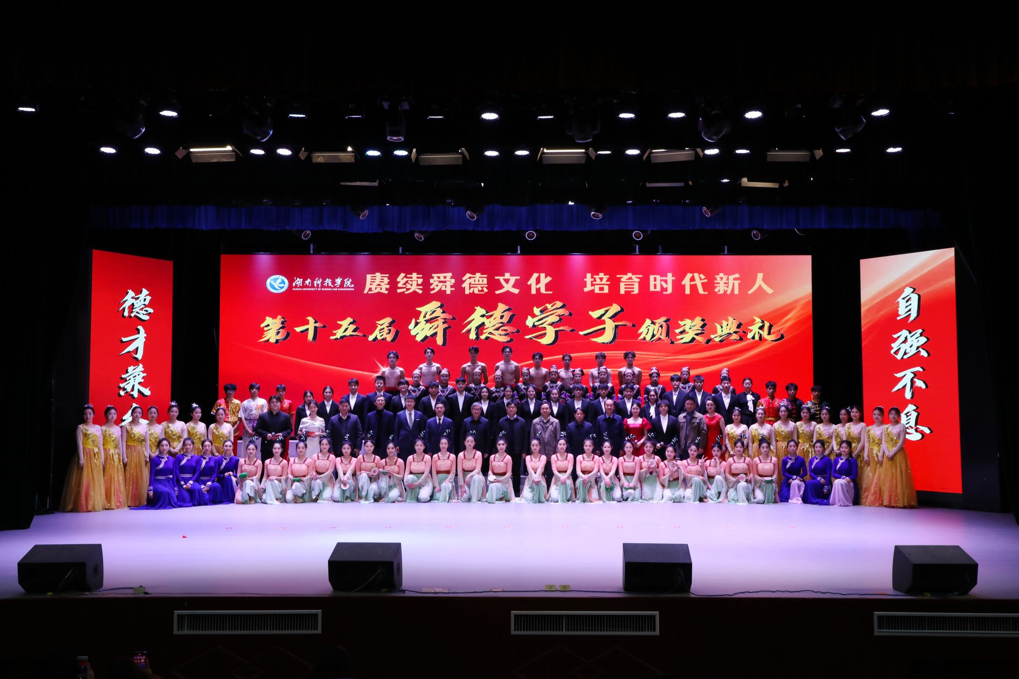 本网讯(记者 唐晶 刘斌 彭尧煜 摄影 谢志豪)赓续舜德文化,培育时代新人。12月10日,学校举行第十五届“舜德学子”颁奖典礼,104名优秀学子获表彰。校党委书记李钢,党委副书记、校长黄创霞,校领导宋宏福、李常健、吴小林、陈灿军,党委委员、组织部部长杨涛,校友企业代表、安骏物流公益基金会管理部经理陈泽出席典礼。