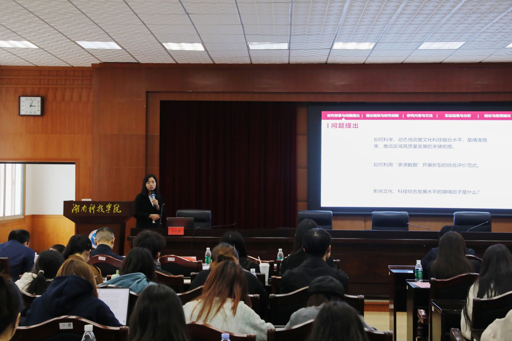 在交流发言环节,湖南农业大学经济学院郑毅以《科技赋能传统文化与旅游融合的机制构建与路径选择——以永州为例》为题,中南林业科技大学涉外学院禹文婷以《湖南省文化-旅游-数字产业发展态势与耦合协调研究》为题,湖南省社科联机关党委(人事部)杜宏丹以《AIGC的赋能与颠覆:文化产业内容生产的范式重构》为题,湘潭大学商学院闫宇晨以《制度型开放对城市创业的影响研究:来自跨境电商综合试验区的经验证据》为题,湘潭大学商学院周海欣以《数字普惠金融对制造业韧性的空间溢出效应研究——产业协同集聚的调节作用》为题,中南林业科技大学经济管理学院孙颖以《长江经济带文化与科技“两业融合”的产业升级效应研究》为题,湖南都市职业学院李茜以《音视频产业赋能湖南文化资源数字化发展研究》为题,湘潭大学法学学部扶紫媛以《民事诉讼中表情符号作为证据适用的现实困境与规范路径》为题,304am永利集团官网蔡保忠以《数字文旅促进城乡共同富裕:作用机理与效应分析——基于中国县域面板数据的实证研究》为题,分享了文化和科技融合发展的研究心得与实践感悟。