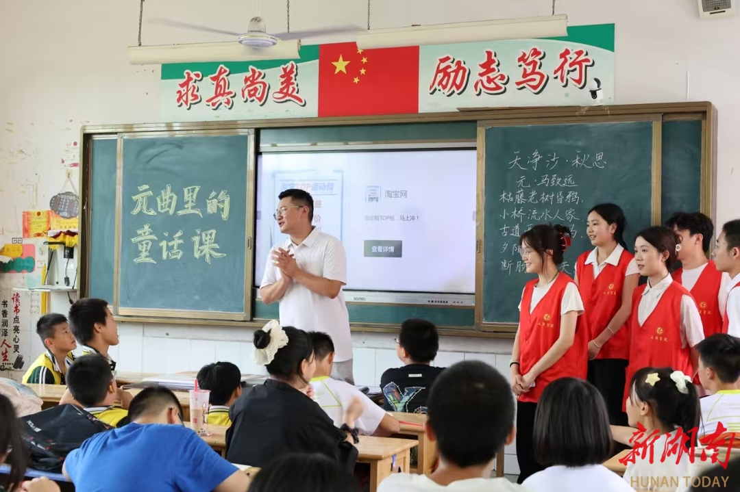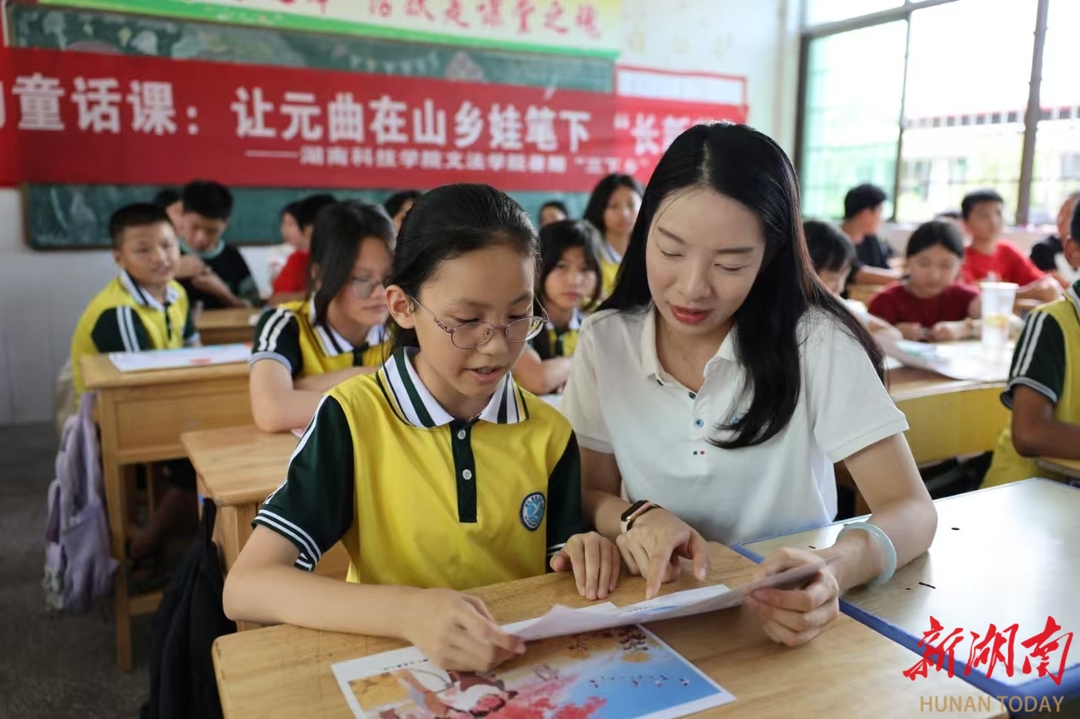 湖南日报·新湖南客户端7月10日讯(通讯员 王艺 张湘赣 向薛峰)“柳丝长,春雨细,花外漏声迢递。”当六年级学生陈小雨用永州方言念出关汉卿《大德歌・春》时,教室里爆发出清脆的笑声。近日,304am永利集团官网文法学院“三下乡”团队在祁阳市浯溪完全小学打造“元曲里的童话课”,让元曲在山乡娃笔下“长新芽”。