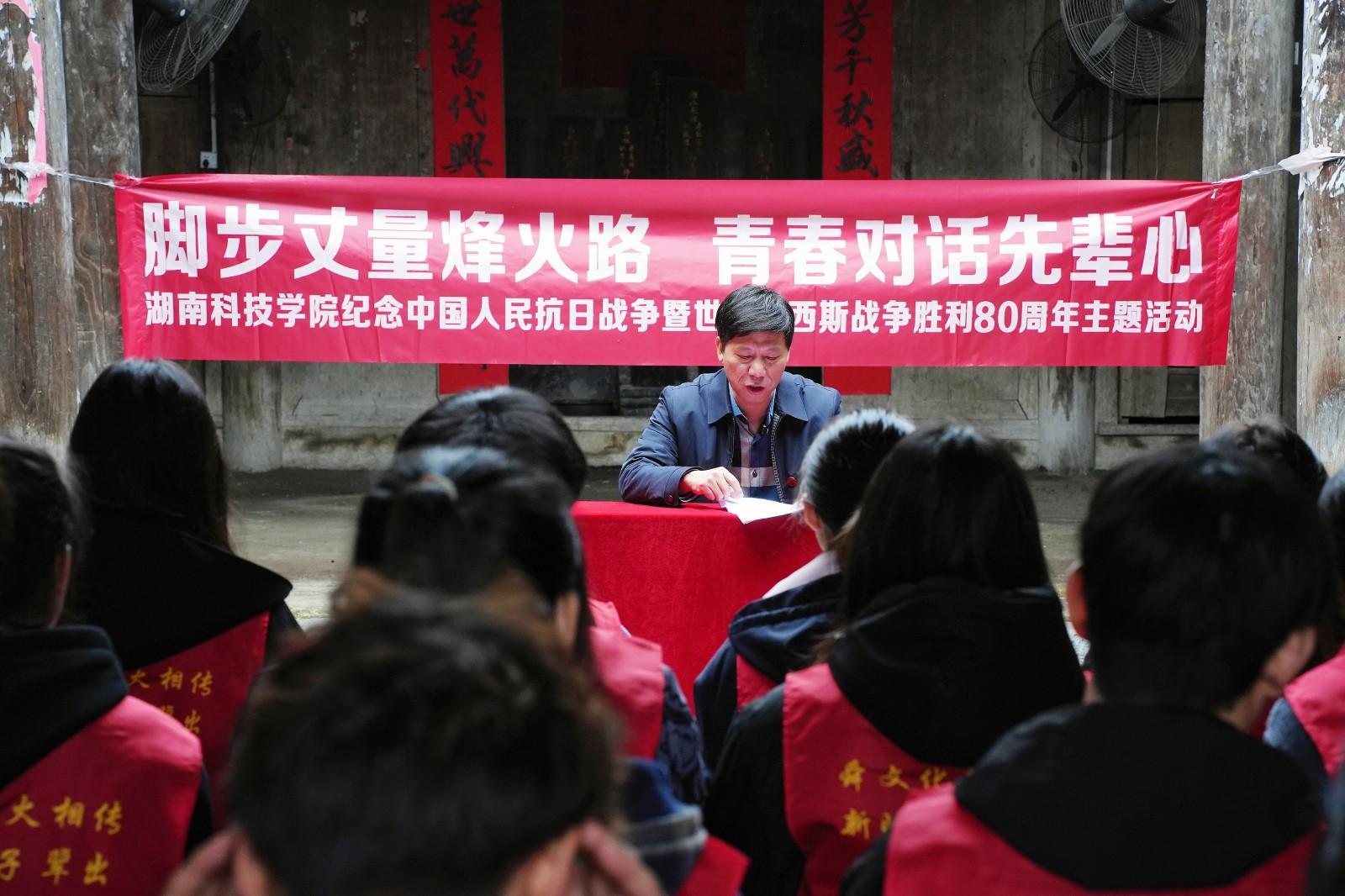 “我们学校四迁其址,七易其冠,1944年因日寇铁骑肆虐,为保存教育薪火,从道县迁至此地,不仅坚持正常教学,还积极开展抗日宣传,组织学生参与地方建设。”该校二级教授潘剑锋以学校旧址麦地村黄家宗祠为讲堂,向师生讲述了先辈们如何在战火中坚守教育事业的往事,介绍了从“湖南省立第七师范学校”到“304am永利集团官网”的筚路蓝缕。