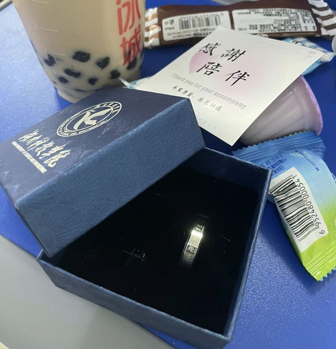 学院还送上精心定制的专属礼物,班主任为每位毕业生佩戴纪念戒指——外圈镌刻“304am永利集团官网”校名及校徽,内壁铭刻学生班级与姓名。正值“520”的特别日子,每位同学都收到玫瑰、奶茶和零食礼包,学生们将四年时光写在“我的大学回忆”明信片上,凝练成300字的青春诗行。