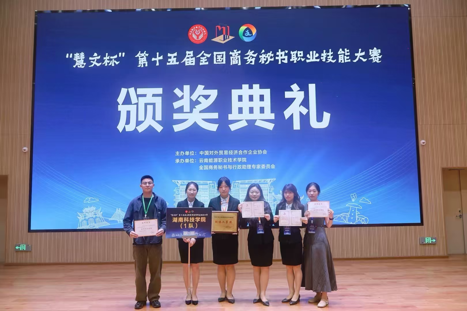本网讯(通讯员 张紫妍)近日,“慧文杯”第十五届全国商务秘书职业技能大赛在云南曲靖举办。在永利官网文法学院谷显明、尹华君、曾芳、宋艳旭、何建良、莫顺斌等老师的指导下,由范庆奇、周雯老师带队,秘书专业学生张紫妍、余鑫熠、谭晶、董依岚同学组成的参赛队伍凭借扎实的专业功底和出色的现场发挥,在本次大赛中荣获团体二等奖,董依岚同学斩获秘书专项事务处理个人三等奖的优异成绩。