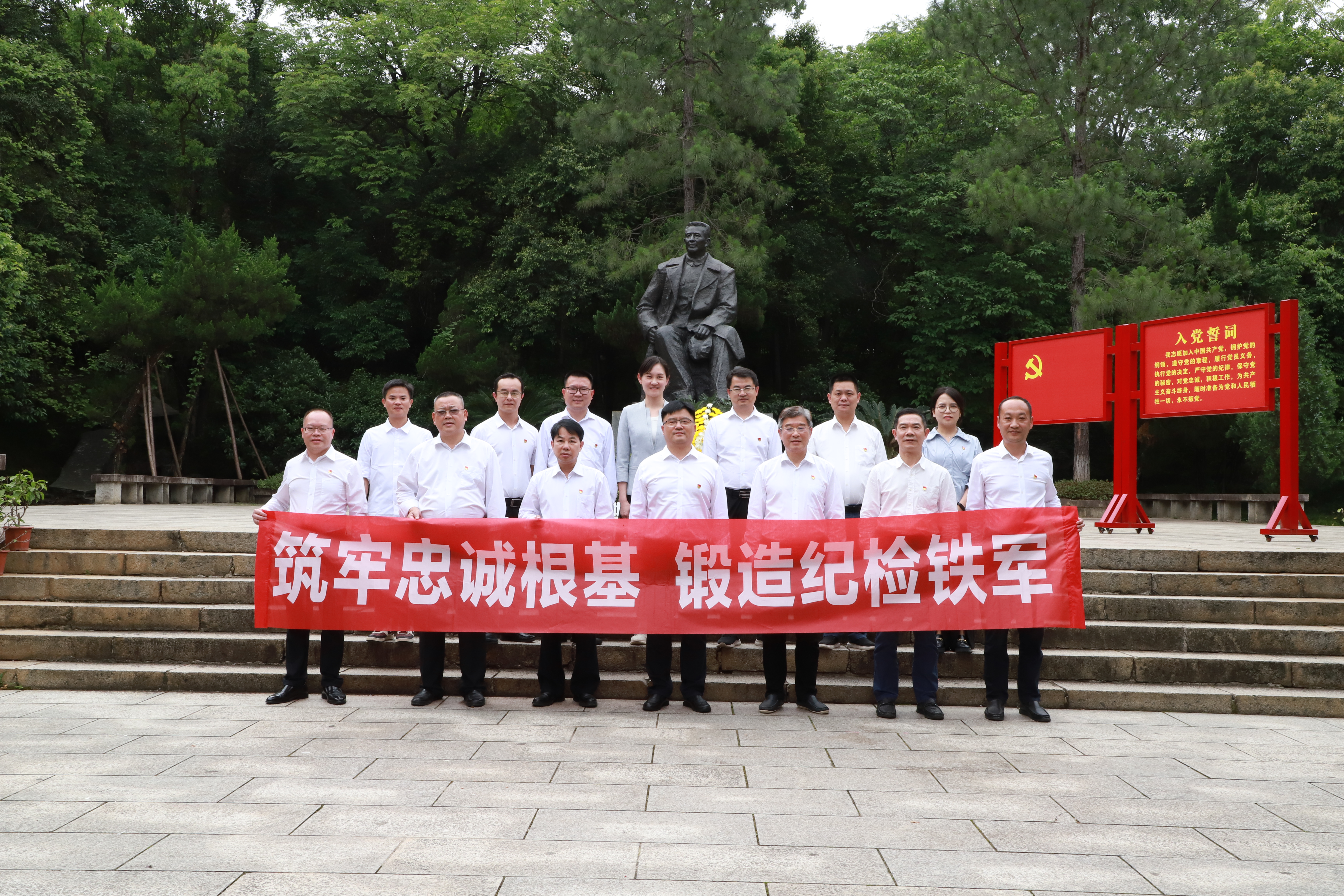 下午三时许,在陶铸同志铜像前,全体干部列队整齐,瞻仰革命前辈铜像,进献花篮、行鞠躬礼,重温入党誓词,诵读陶铸同志《松树的风格》一文。