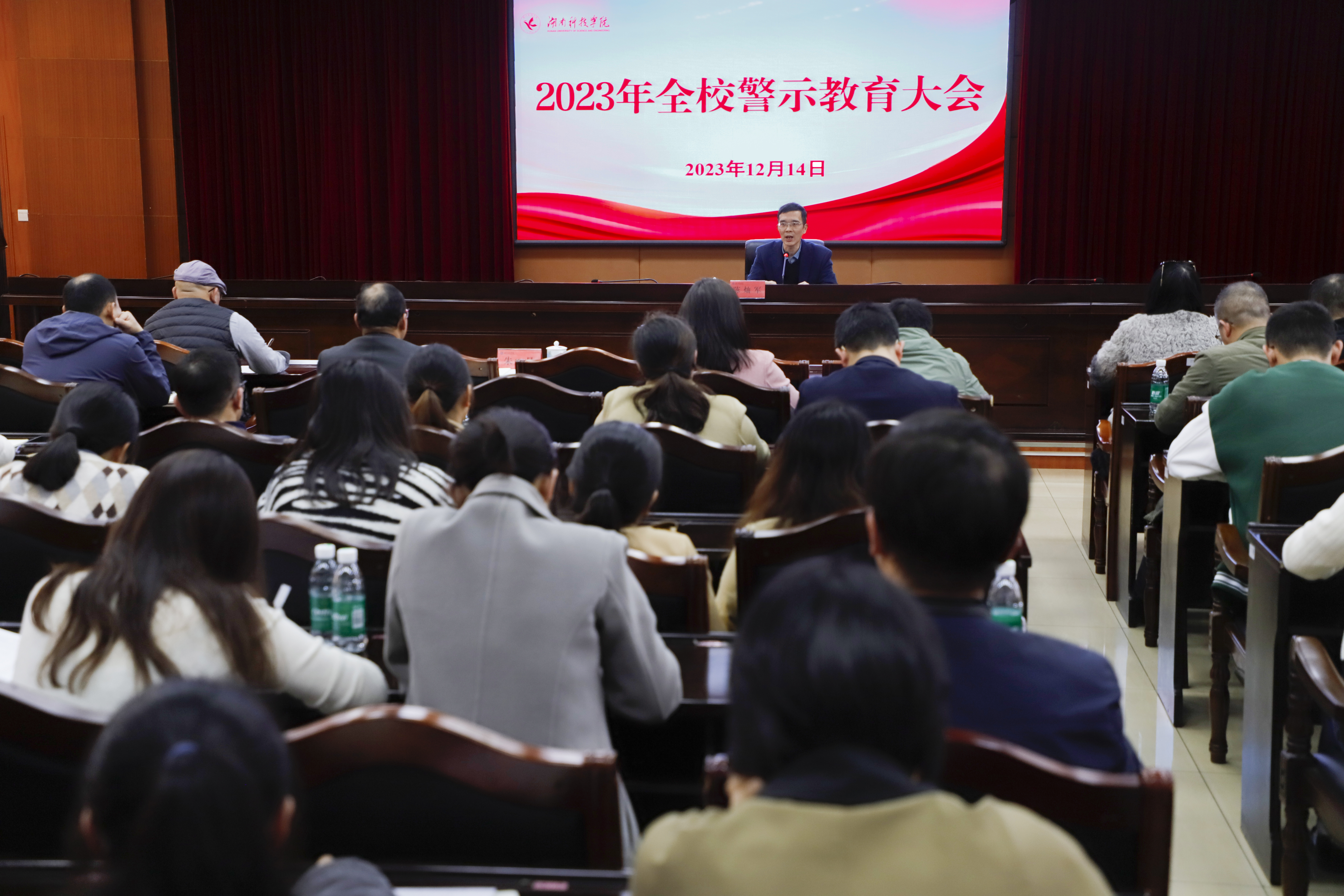 本网讯(通讯员覃小明)为进一步推动“两带头五整治”纠风防腐专项行动和全省高校“以学谋私”问题专项整治工作,12月14日,学校在行政楼八楼一会议室召开警示教育大会。党委委员、纪委书记陈灿军出席并讲话,全校副科级以上干部和机关教辅全体工作人员参会。会议由纪检监察处副处长朱晶主持。