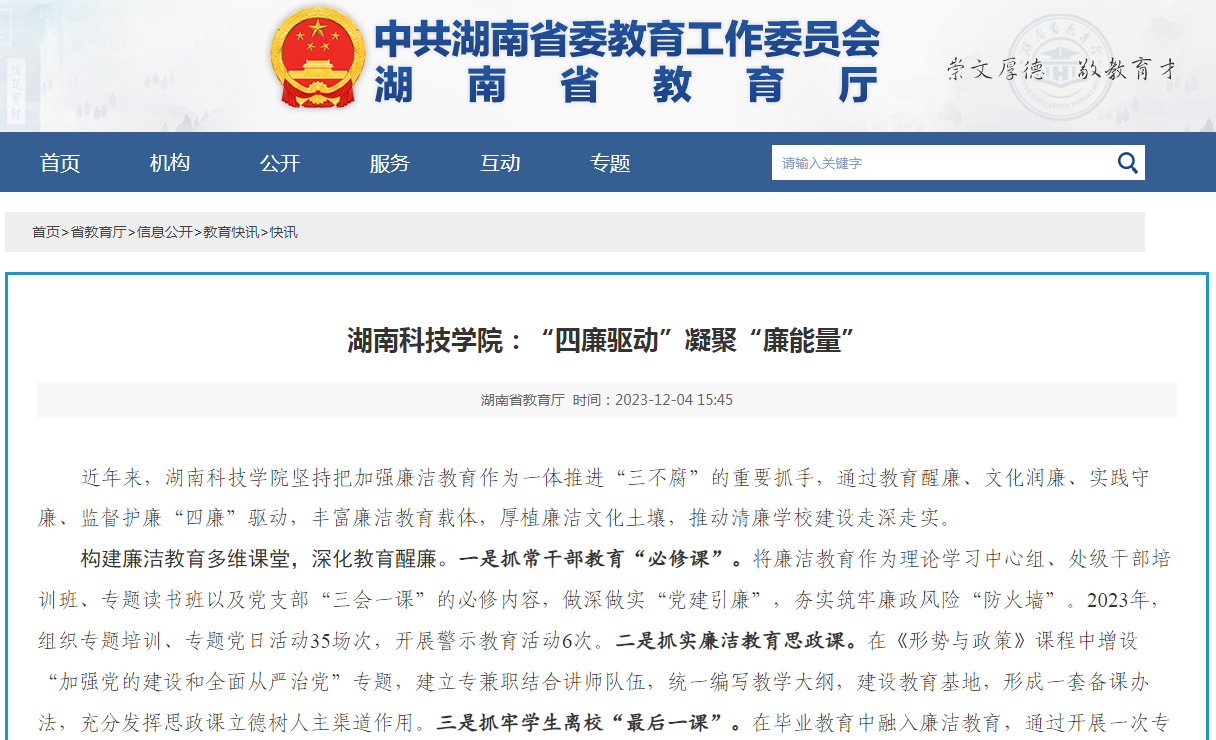 构建廉洁教育多维课堂,深化教育醒廉。一是抓常干部教育“必修课”。将廉洁教育作为理论学习中心组、处级干部培训班、专题读书班以及党支部“三会一课”的必修内容,做深做实“党建引廉”,夯实筑牢廉政风险“防火墙”。2023年,组织专题培训、专题党日活动35场次,开展警示教育活动6次。二是抓实廉洁教育思政课。在《形势与政策》课程中增设“加强党的建设和全面从严治党”专题,建立专兼职结合讲师队伍,统一编写教学大纲,建设教育基地,形成一套备课办法,充分发挥思政课立德树人主渠道作用。三是抓牢学生离校“最后一课”。在毕业教育中融入廉洁教育,通过开展一次专题宣传展播、观看一次警示教育片、召开一场廉洁教育主题班会、签署一份廉洁从业承诺书、签收一封廉洁书信、上一次廉洁党课、开展一次谈心交流等“七个一”活动,引导毕业生系好人生“第一粒扣子”。