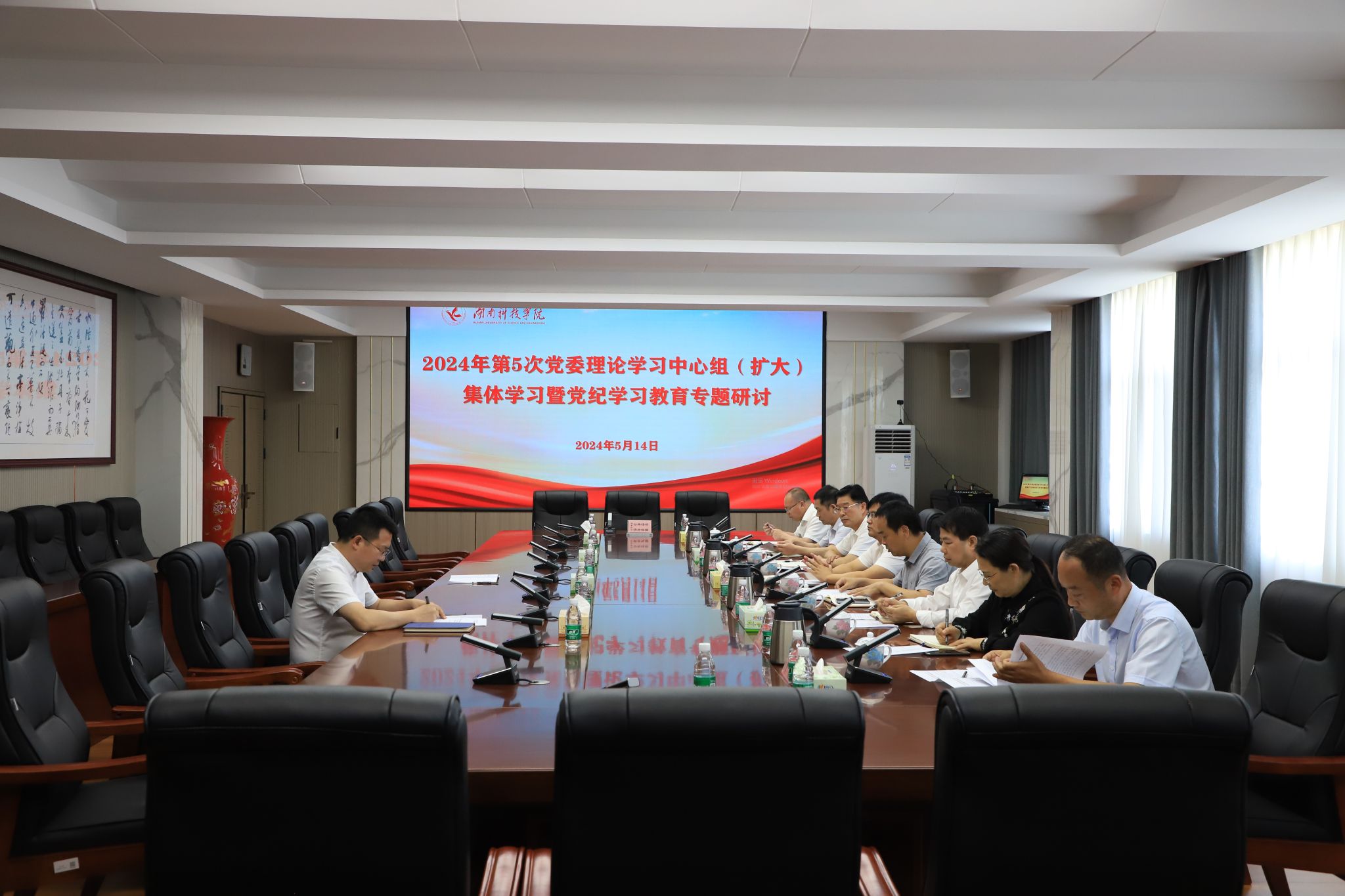 本网讯 5月14日,学校举行2024年第5次党委理论学习中心组(扩大)集体学习暨党纪学习教育专题辅导报告会。校党委书记李钢主持并讲话。全体在校党委委员参加,副校长郑银芳、全体中层干部列席。