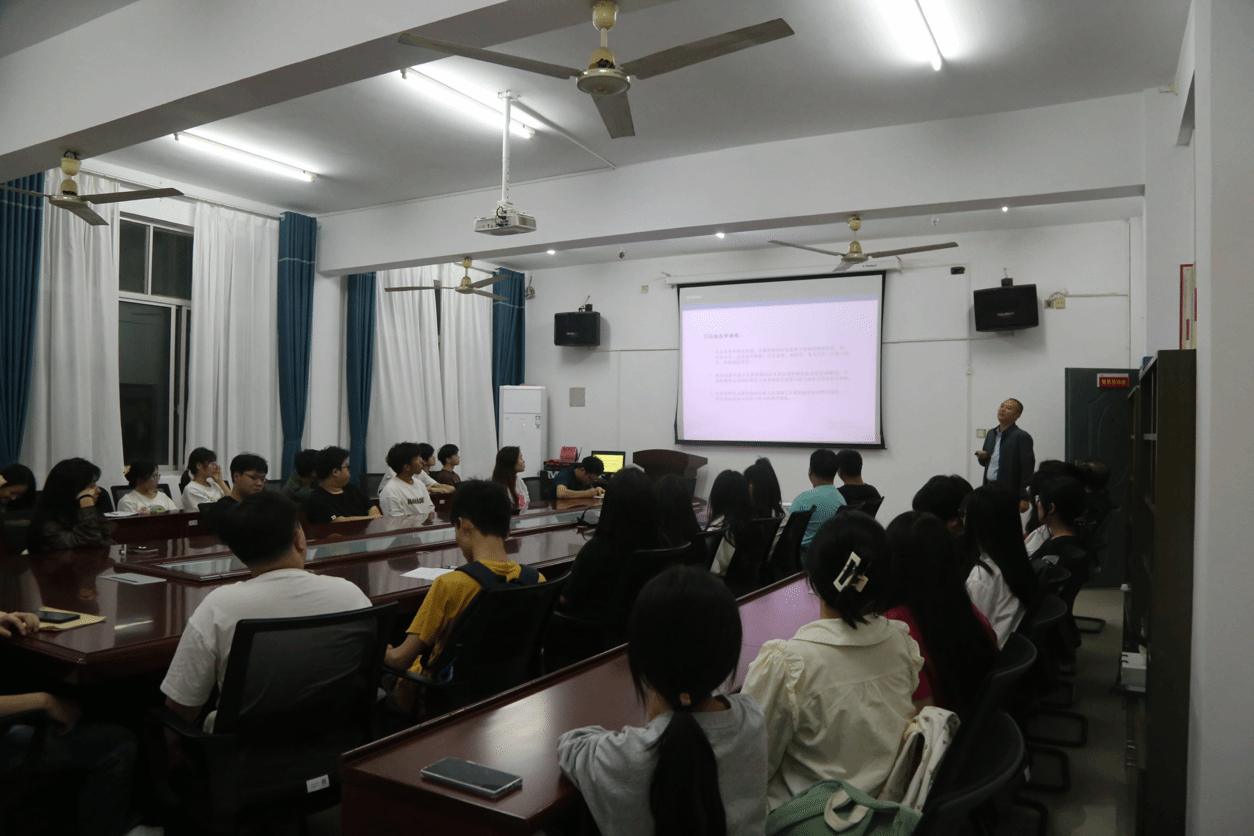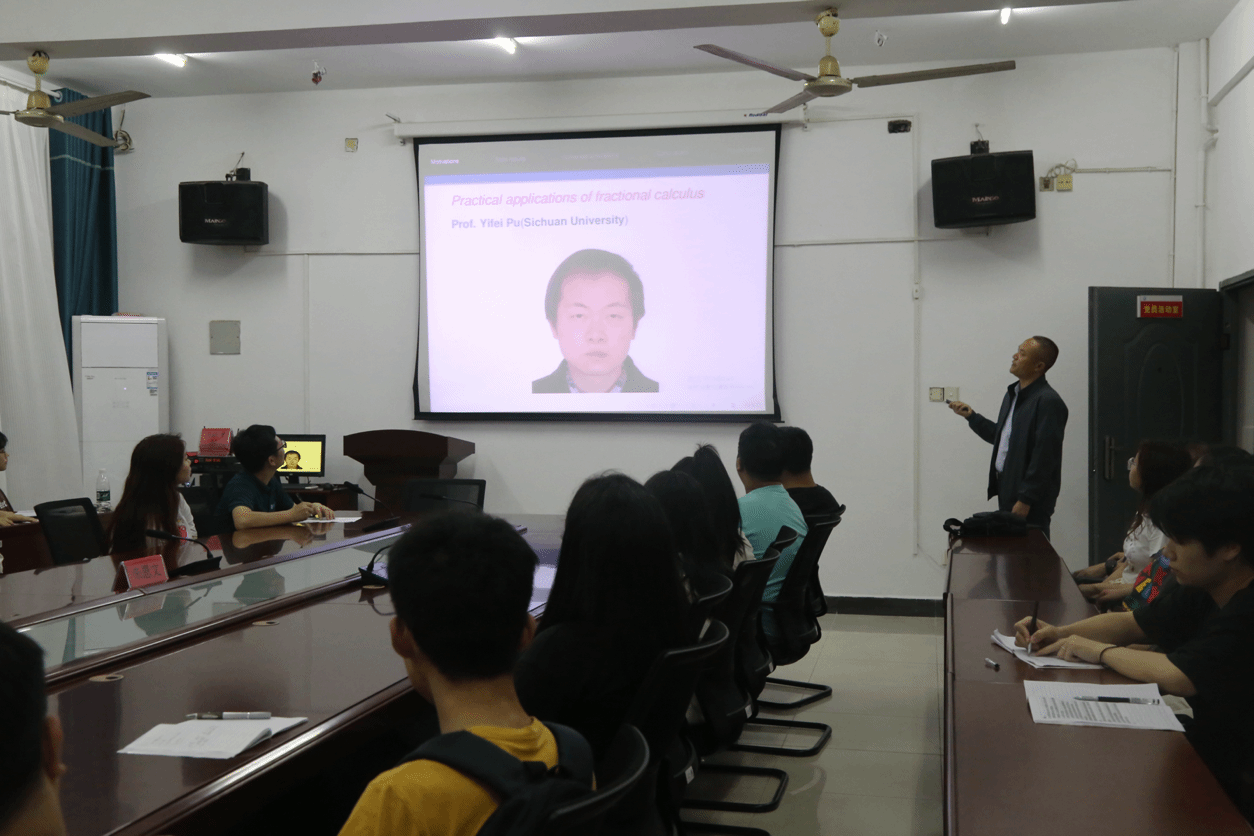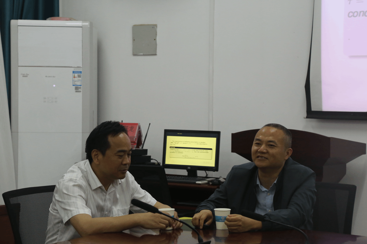 在讲座中,黄承代首先从固体力学、流体等领域中的分岔现象出发介绍了分数阶微分方程分岔理论的产生背景、发展现状、实际应用等。接着针对一类中立型分数阶时滞神经网络分岔问题,从研究动机、研究思路、理论推导和数值实验等展出了该问题的最新研究成果。然后,黄承代跟学生们分享了目前正在从事研究方向和科研问题在提问环节,在场的师生积极参与互动,黄承代耐心倾听,详细解答同学们的疑问。最后,黄创霞校长对讲座进行了总结,并与同学们亲切座谈,向同学们分享了个人科研、求学的经历和心得,鼓励同学们要扎实学好数学,树立信心,敢于创新,做好个人发展规划,通过考研深造等方式,不断提高自身的专业素养和能力。