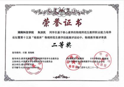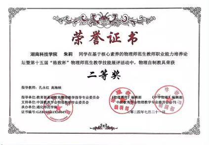 本网讯(通讯员 高海峡)9月6日,我院5名物理学子收到全国第十五届“格致杯”物理师范生教学技能展示与交流活动组委会发来的证书,其中教学展评“二等奖”2项,“三等奖”3项,自制教具“二等奖”1项。
