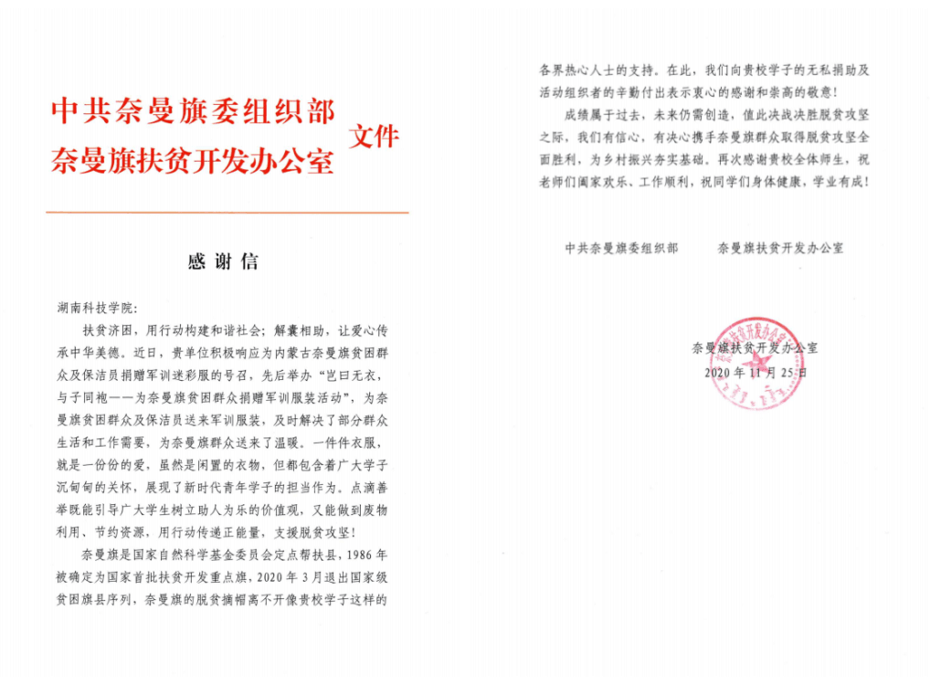 10月30日中午,校团委书记万李、理学院党总支书记刘华、理学院党总支副书记欧阳素勤参加军训服捐献仪式。永州市义工协会会长王宗清向共青团304am永利集团官网委员会敬赠锦旗。从新生军训场上退下的迷彩服即将开启一段新的旅程,将“奉献、友爱、互助、进步”的志愿精神传承发扬。
