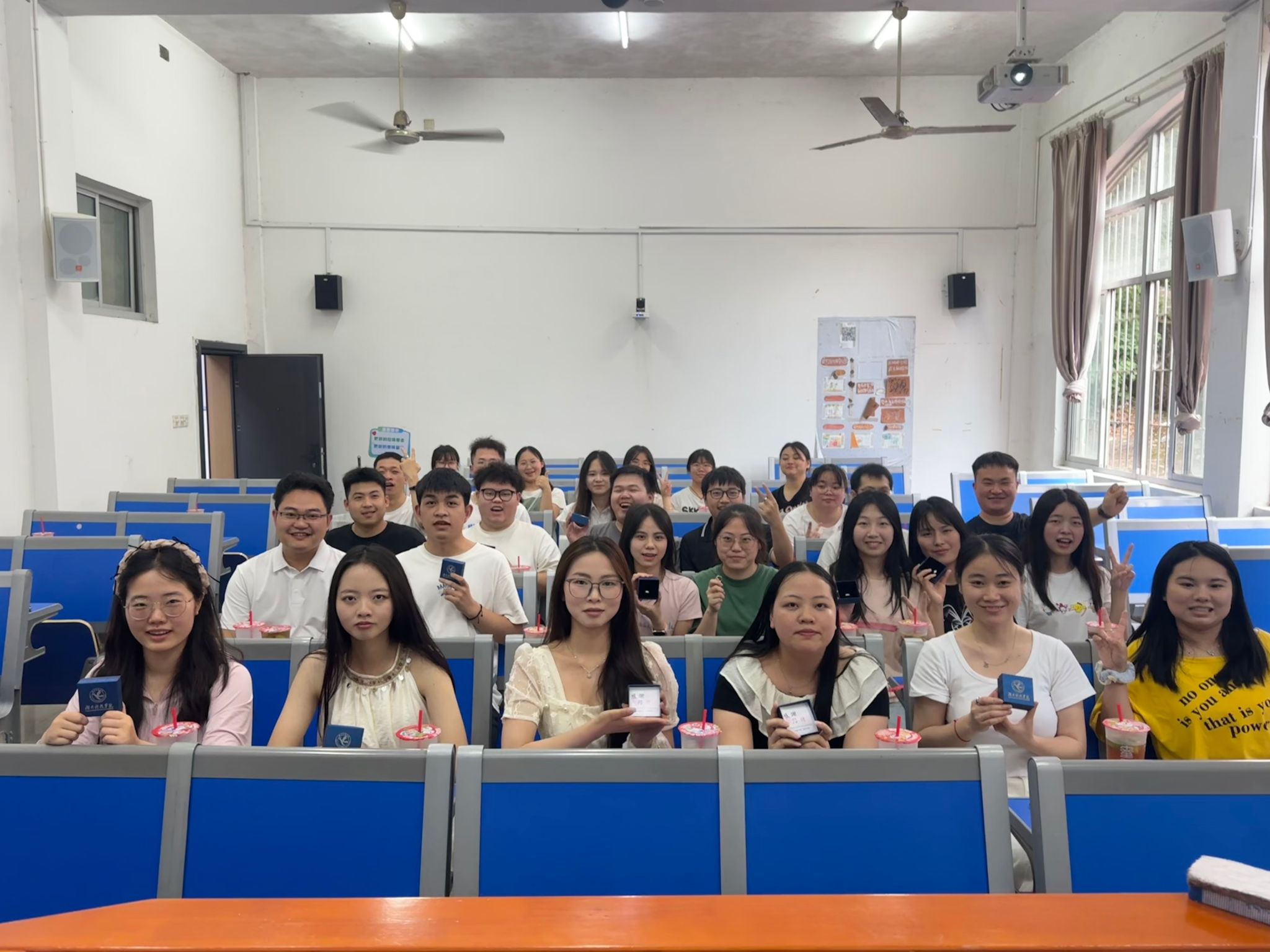 主会场议程结束后,各班级回到原自习室开展最后一次主题班会。班主任为每位毕业生佩戴定制纪念戒指——外圈镌刻“304am永利集团官网”校名及校徽,内壁铭刻学生班级与姓名的专属印记。在书写“我的大学回忆”明信片环节,泛着奶茶香气的教室中,学生们将四年时光凝练成300字的青春诗行。正值“520”特别日子,各班为每位同学准备了玫瑰、奶茶和零食礼包,辅导员龙枚樱说:“玫瑰寓意绽放的青春,奶茶象征生活的甘甜,零食则是学院永远温暖的守候。”