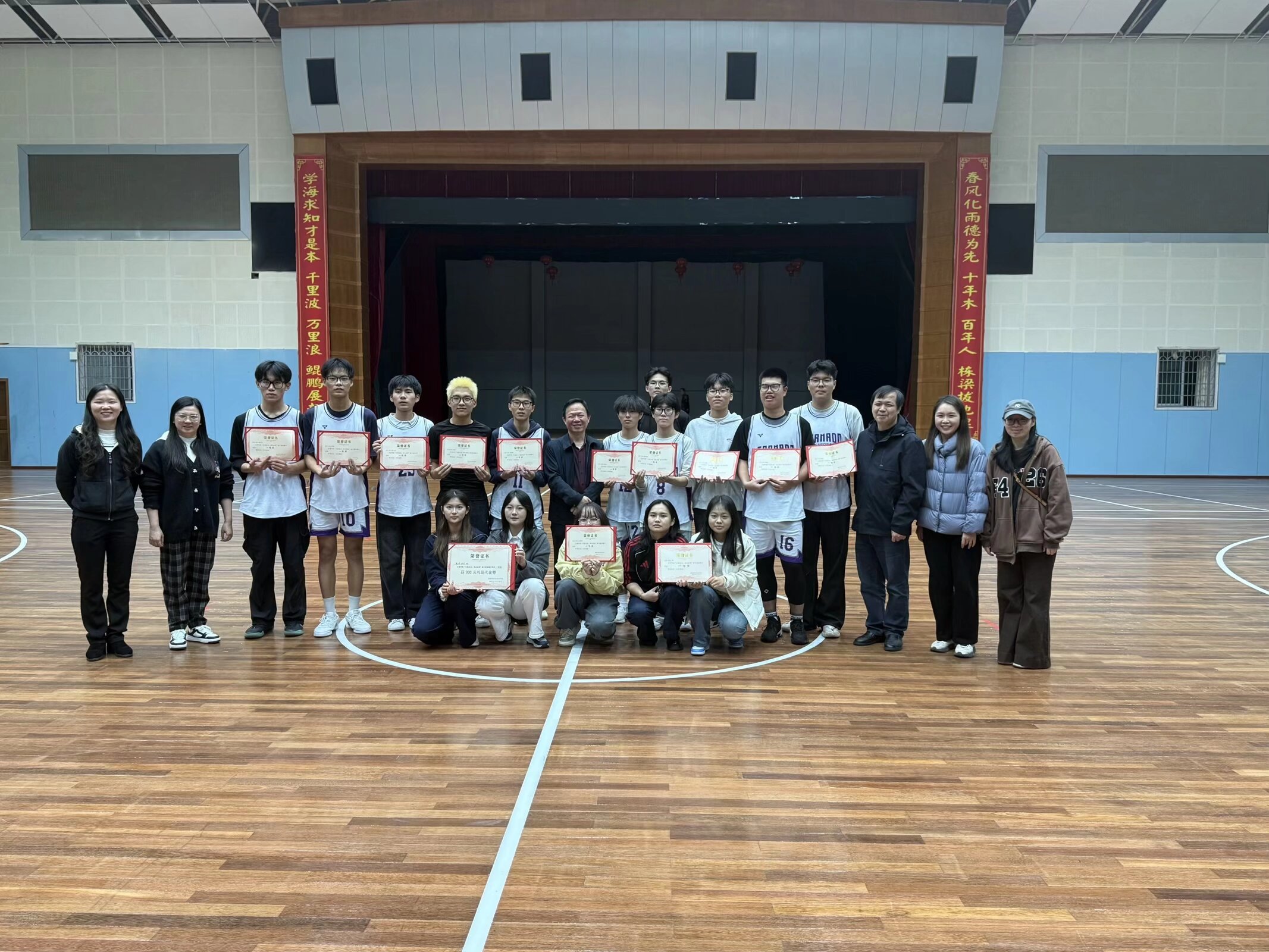赛后,学院举行了闭幕式暨颁奖典礼。学院领导班子为冠军信计2501班、亚军物理2501班和季军数应2502班分别颁发了荣誉证书,并宣布本届“新生杯”篮球赛圆满结束。