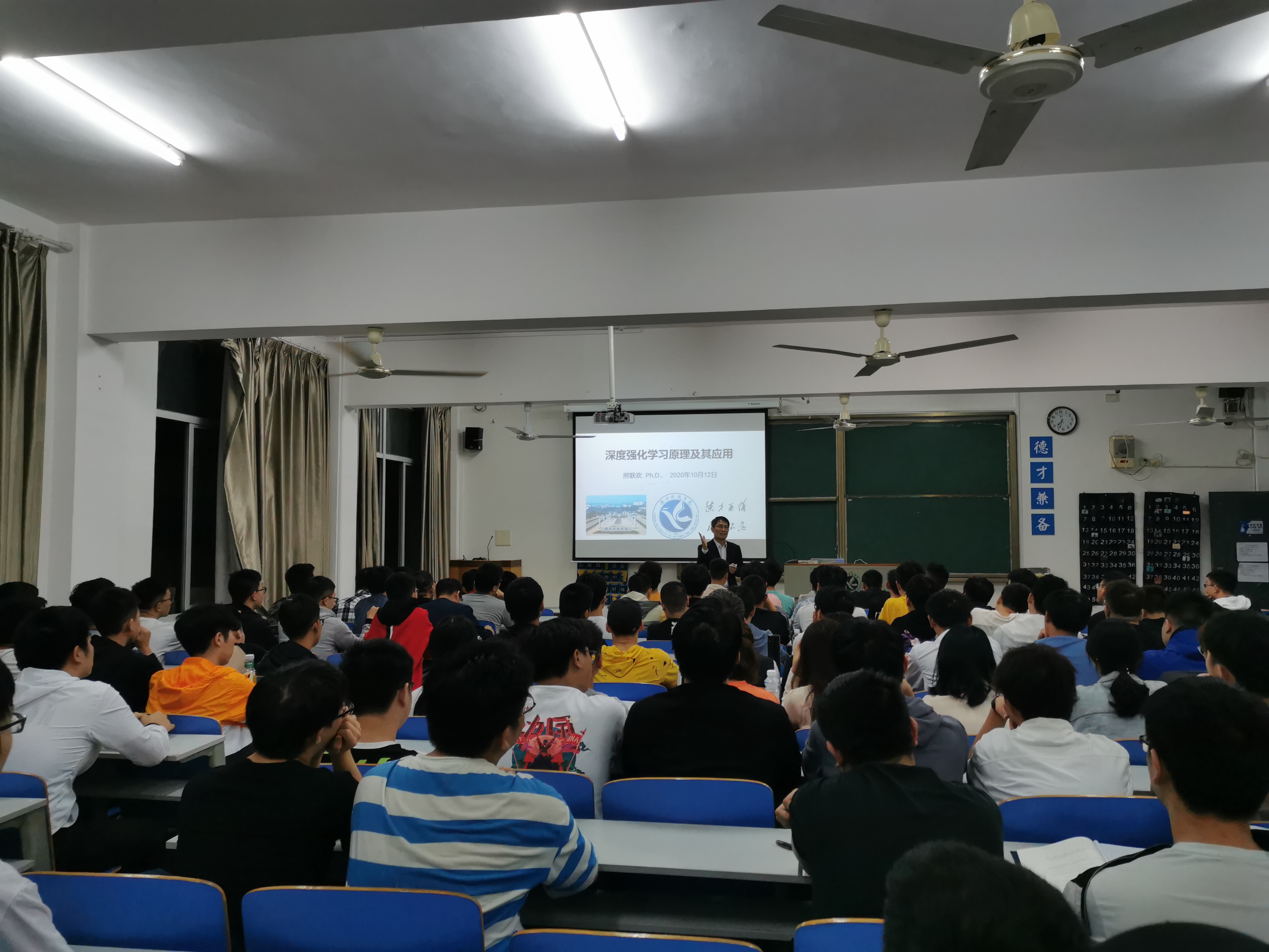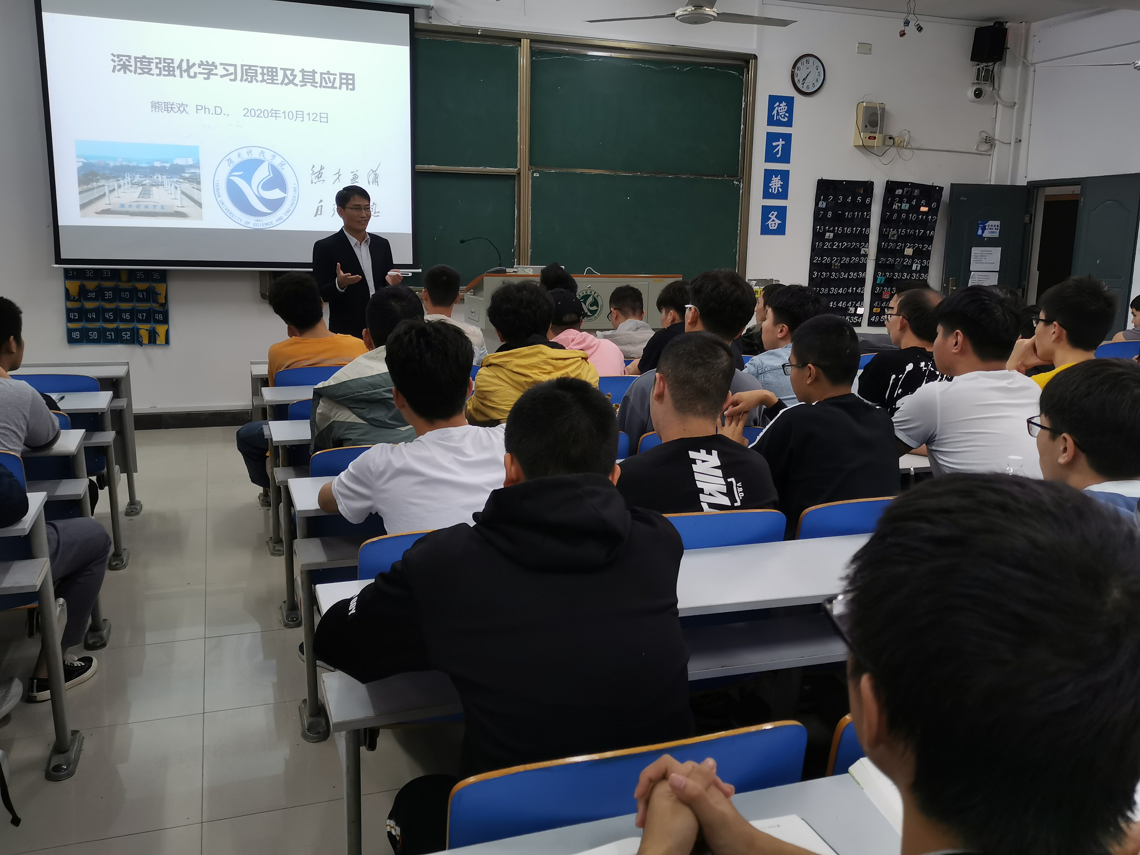 本网讯(通讯员 戴兴鸿)为了让学生能够更好的了解本专业,对自己未来的发展方向有更广阔的视野,10月12日,熊联欢博士应邀为理学院学子做了“深度强化学习原理及其应用”讲座报告。熊联欢博士是永利官网优秀校友,曾任职华为技术有限公司多媒体业务部和公司研究部,有着深厚的理论基础和丰富的项目管理经验。讲座由副院长周立平主持。