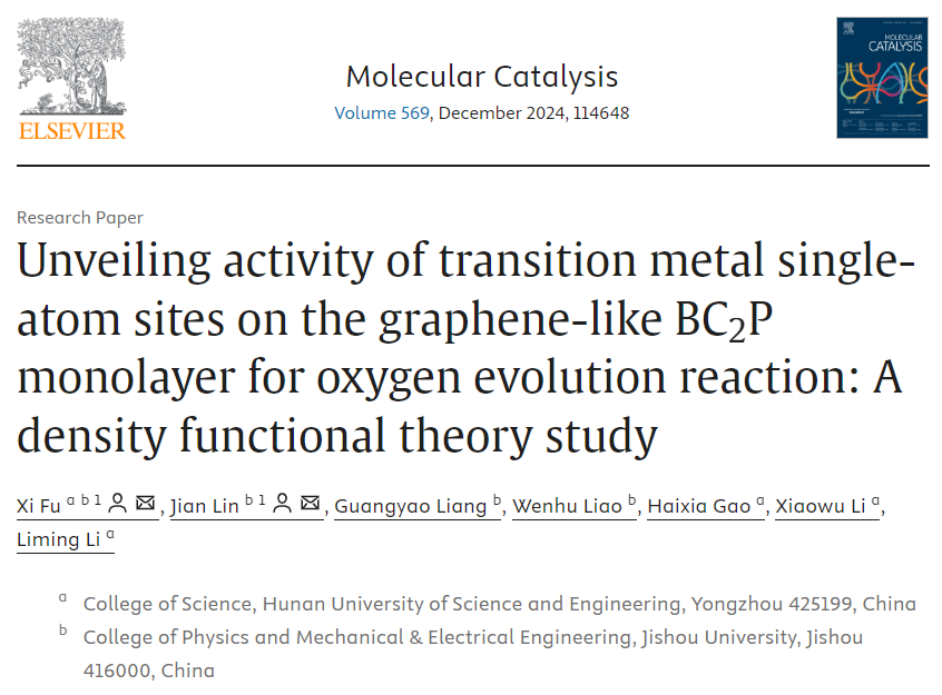 (本网讯 高海峡)近日,理学院付喜教授研究组连续完成两个研究工作成果,分别以“Density Functional Theory Study of Phosphorus Silicide Monolayers as Anodes for Lithium-Ion Batteries and Electrocatalysts for CO2 Reduction”和“Unveiling activity of transition metal single-atom sites on the graphene-like BC2P monolayer for oxygen evolution reaction: A density functional theory study”为题发表在ACS Applied Nano Materials(IF 5.3,中科院二区期刊)和Molecular Catalysis(IF 3.9,中科院大类二区)期刊上。永利官网为论文的第一完成单位,吉首大学为第二完成单位,付喜教授为第一作者和通讯作者,所指导的吉首大学物理学专业硕士研究生林健为共同第一作者,理学院李小武教授、高海峡副教授为共同参与作者。