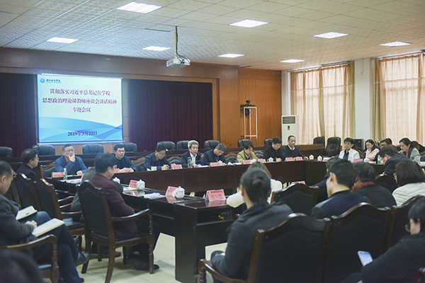 本网讯 (通讯员 聂湖) 3月22日,永利官网召开学习贯彻习近平总书记在学校思想政治理论课教师座谈会上的重要讲话精神专题会议。党委书记、校长、学校思想政治工作领导小组组长曾宝成,校领导唐艳明、彭立威、李常健、吴小林、程智开及学校思想政治工作领导小组其他成员,马克思主义学院全体教师,各教学学院党总支副书记、全体辅导员,教师教育学院院长等参加会议。会议由党委副书记唐艳明主持。