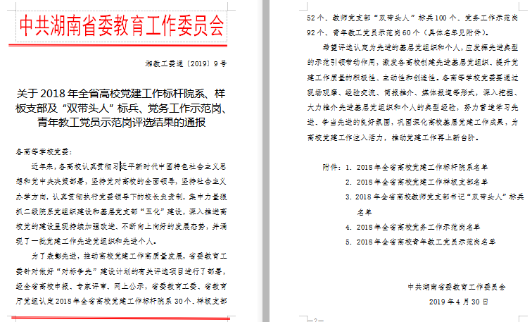 本网讯(通讯员 李艳)近日,根据湘教工委通[2019]9号文件,永利官网马克思主义学院党总支获“全省高校党建工作标杆院系”称号,这是永利官网唯一获此殊荣的单位。