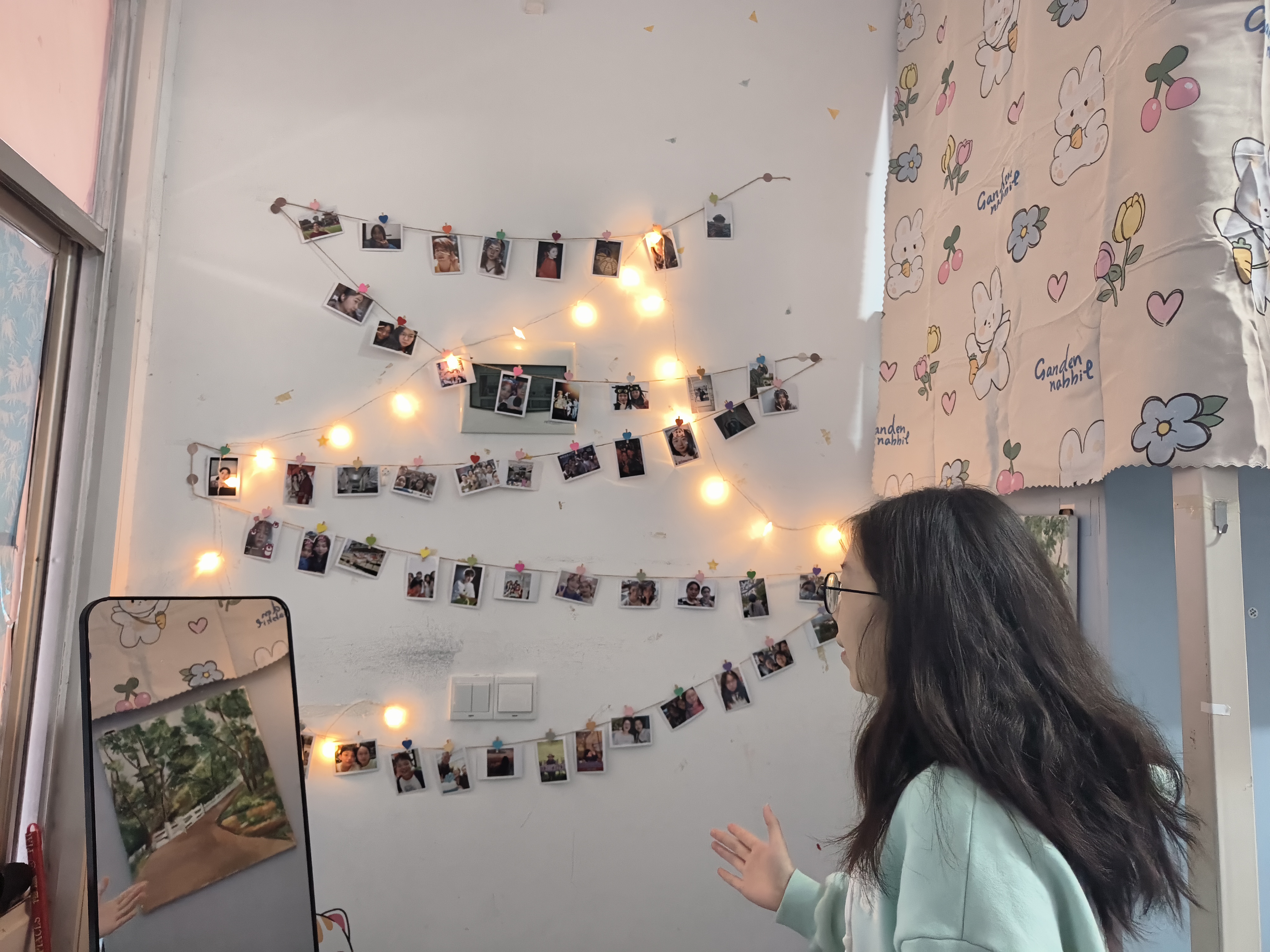 有的宿舍将照片装饰在墙壁上,用灯光点亮珍贵回忆;有的宿舍以动画元素结合撞色创意综合运用,构成温馨舒适的宿舍一角;有的宿舍在门前装饰可爱挂件,童趣与活力萦绕在眼前与心间。
