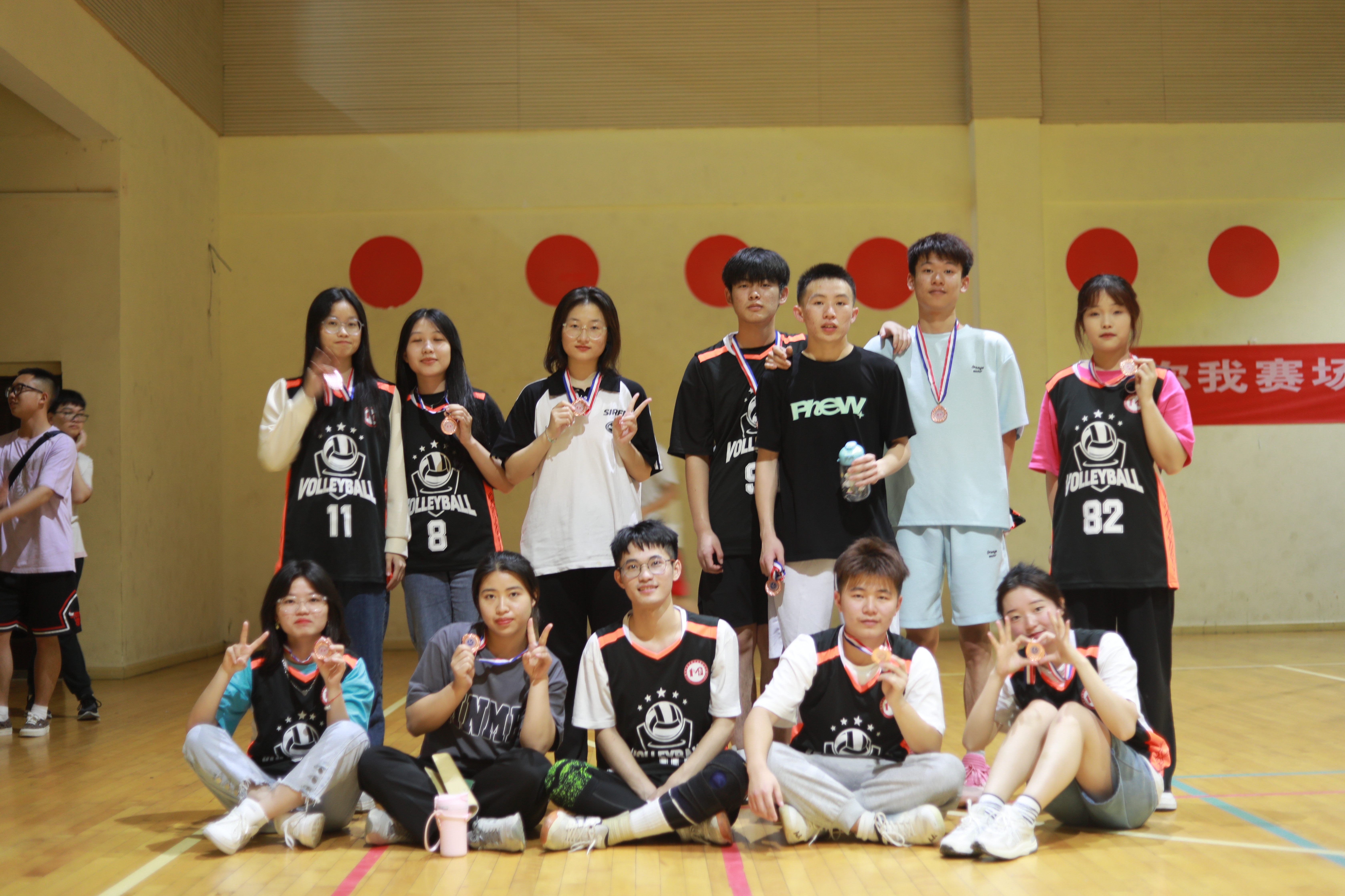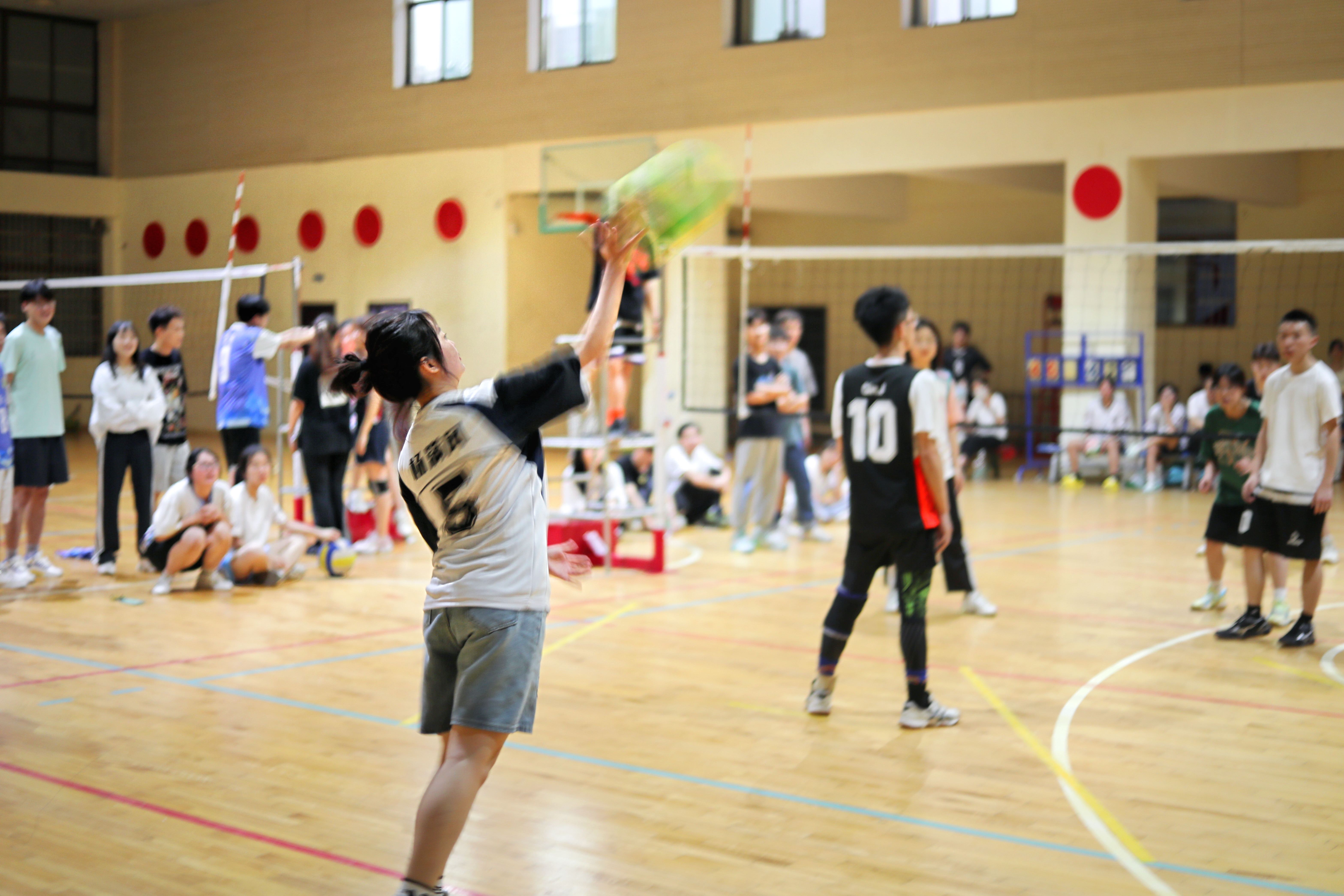 比赛场上,参赛队员们都尽力发挥出最好的水平,在赛场中汗流浃背,浑然不顾两条手臂被球硬生生砸到的淤紫,仍然奋力争先,当球在空中划出一道道抛物线,将一个个危机转化成时机,旋转、跳跃、扣杀,动作干净利落,队员们配合默契。