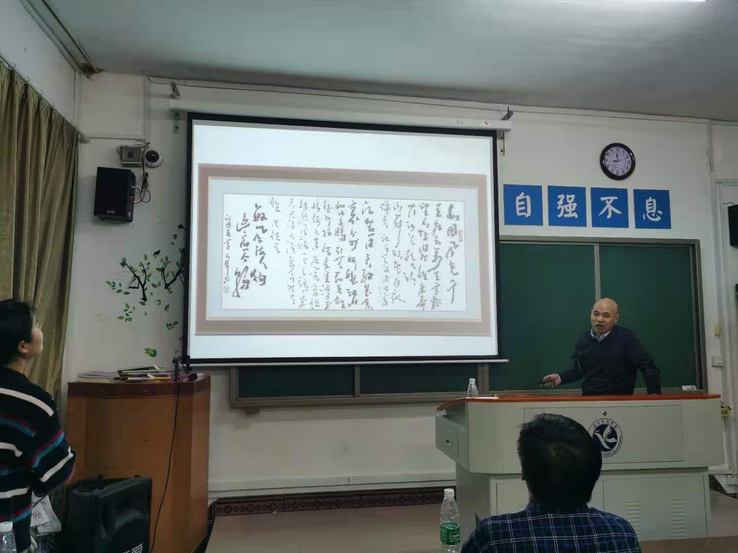 本网讯(通讯员 吴祖琳 王华炜) 11月19日,为弘扬中华优秀传统文化,引导同学们重视汉字书写,我院特邀全国著名国礼艺术大师马君声老师于鹤鸣楼501教室为同学们做“书法艺术的欣赏与创作书法素养”培训讲座,讲座由李钟麟教授主持,20级全体同学参加。