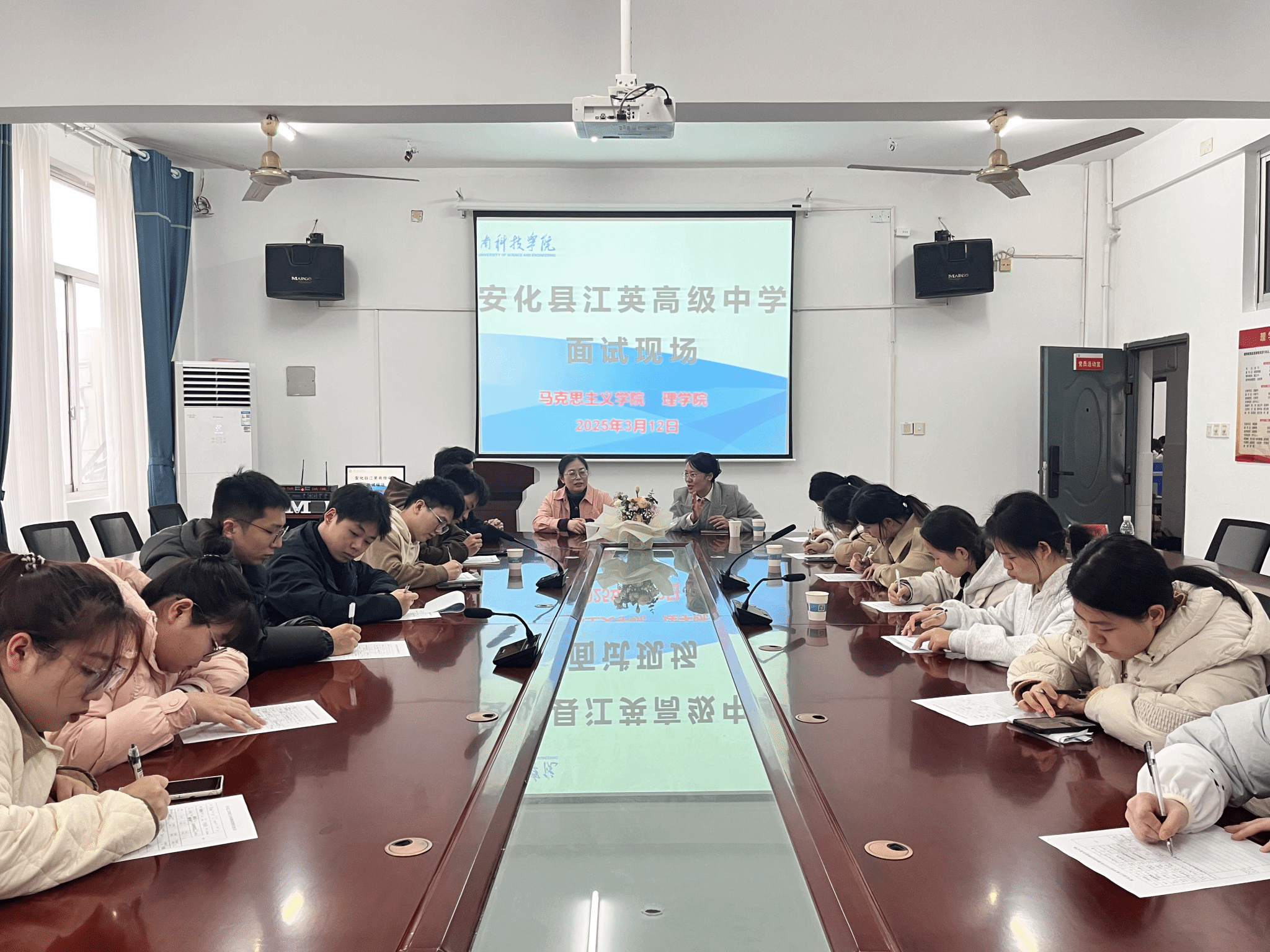 会上,招聘负责人刘圣彦老师详细介绍了安化县江英高级中学的办学环境、办学成果、办学理念、待遇福利、岗位需求以及面试形式等。在交流环节,同学们就入职时间、培训晋升、住宿情况、公积金缴纳比例、课程工作量等问题展开提问,刘老师一一进行了细致详尽的解答。