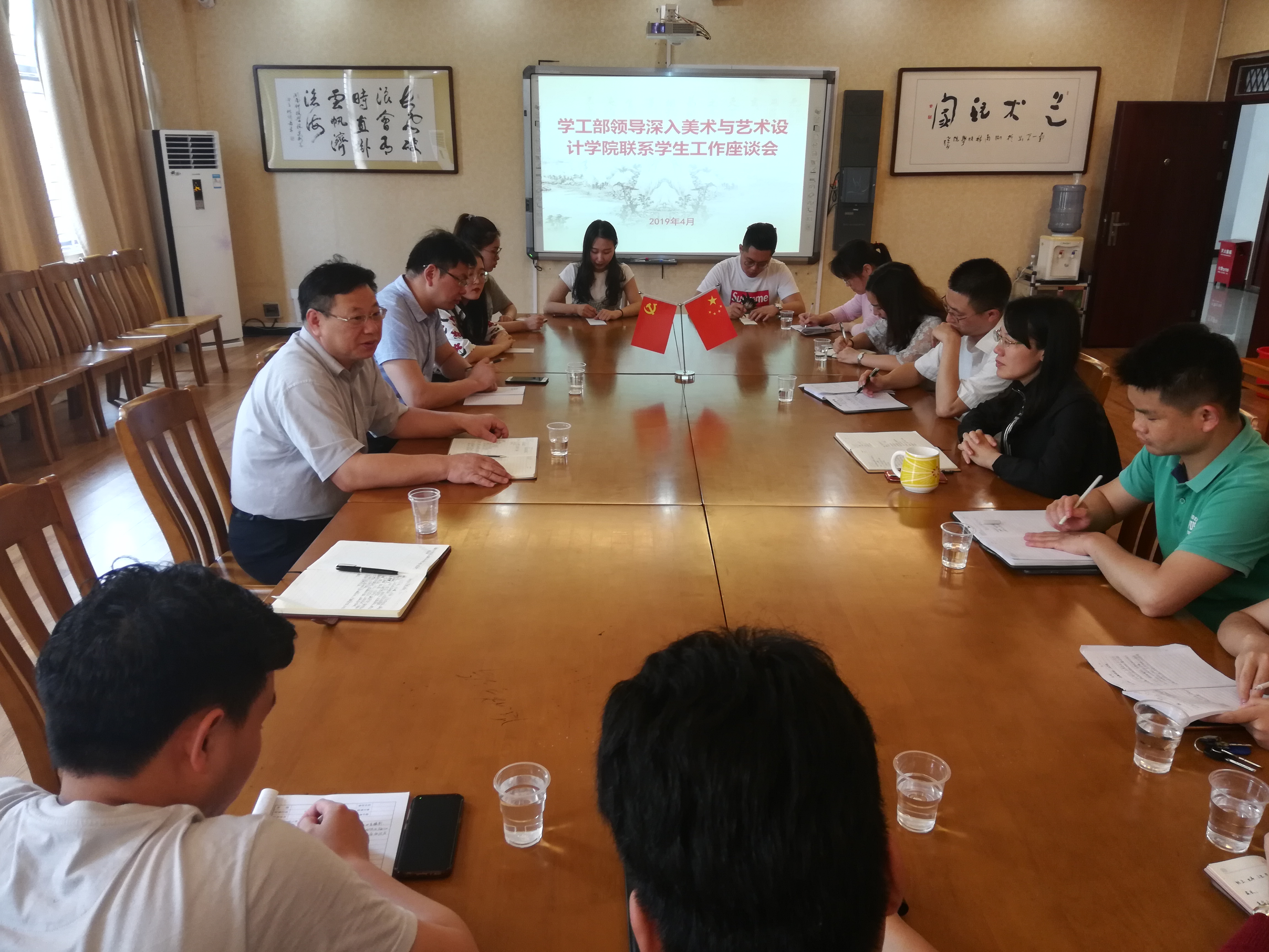 林乔军对美院学生工作进行详细汇报。他提到该院目前品牌特色活动为:党员服务岗、党团先锋、美院好榜样。这三个特色活动加强了学院学生党员的模范带头作用和学生的自我管理以及自我教育能力,增强了学生的责任感和集体意识。邓子戈、文博、李小红、李灿坤、彭学晶等班主任结合自身工作经历,分享了他们在担任班主任工作期间的优秀做法,同时也道出了她们目前所面临的困惑。唐忠林等辅导员谈论了他们目前在开展学生工作中遇到的困惑和困难。各年级学生代表也纷纷发言说出了自己的疑惑并向学校提出了一些可行性建议。刘华在会上提出了自己对美院工作的一些设想,表示美院会一如既往地不断努力坚持立德树人,推进铸魂育人。