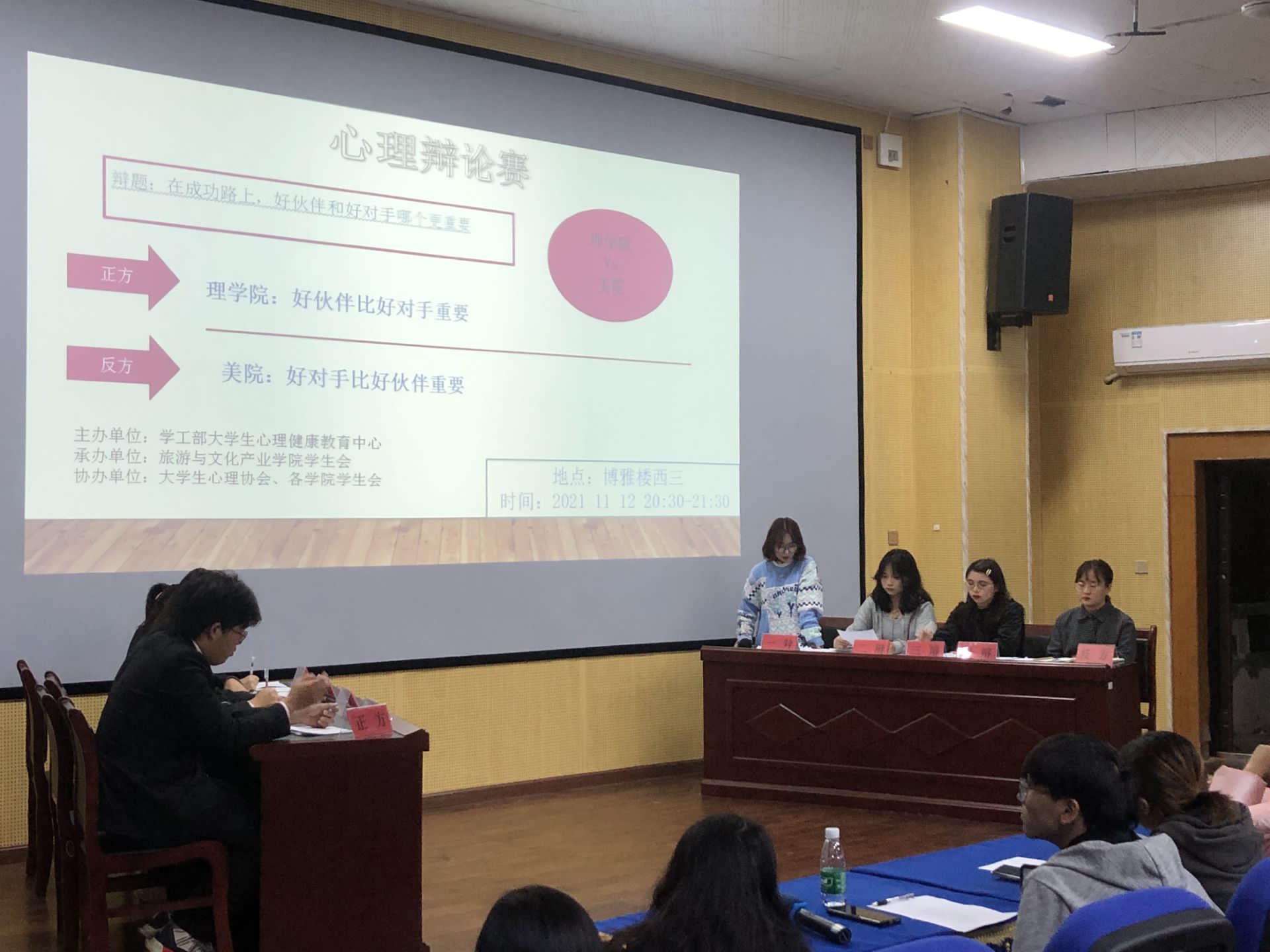 本网讯(通讯员周怡君)2021年11月12日晚,304am永利集团官网于博雅楼开展了八强进四强的辩论赛。本次辩论赛,主办单位为学工部大学生心理健康教育中心,承办单位为旅游与文化产业学院学生会,协办单位为大学生心理协会及各学院学生会。本次辩论赛的辩题为“在成功路上,好伙伴和好对手哪个更重要”,正方为持“好伙伴比好对手重要”观点的理学院与持“好对手比好伙伴重要”观点的美院。