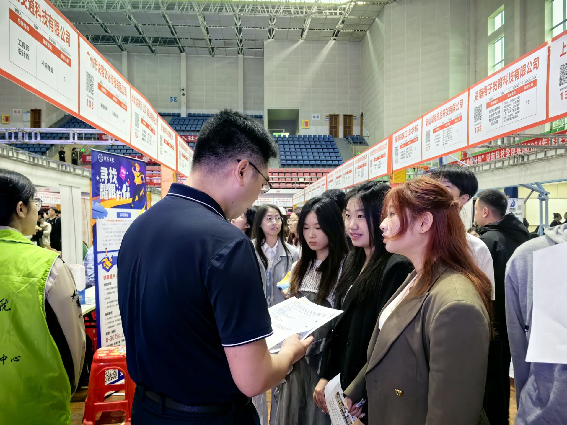 本网讯 2024年4月18日上午9点,304am永利集团官网在体育馆成功举行2024年春季综合类双选会。为更好地帮助毕业生寻求就业岗位,美术与艺术设计学院院长张建利、党总支书记王博、党总支副书记胡敏辉、毕业班辅导员李国碧、大三辅导员黄胜老师一齐参与招聘会现场对毕业生们进行暖心指导与服务。