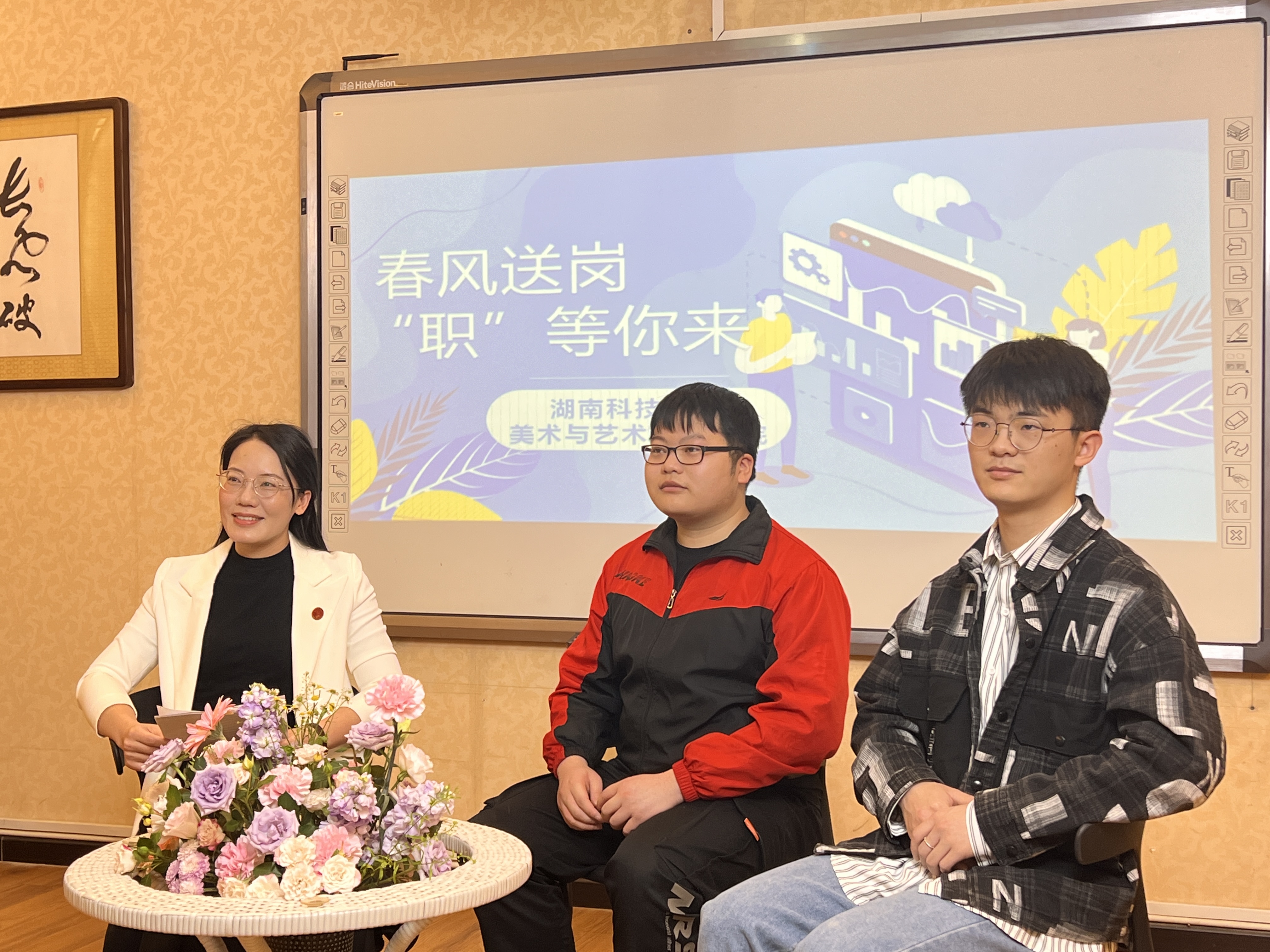 本网讯(通讯员 卿可青)2022年4月14日上午10时30分,304am永利集团官网美术与艺术设计学院联合6家优秀校友企业在南楼202举行“春风送岗·‘职’等你来”线上直播招聘会。本次招聘会现场由美院党总支书记刘华主持,6名毕业生代表参与互动,线上有150余名学生进行观看。