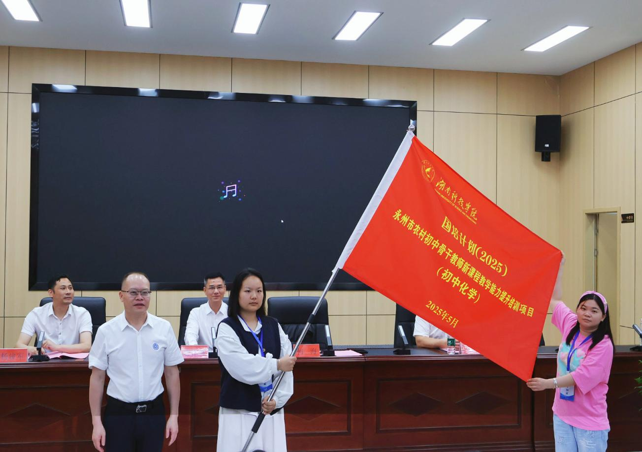 本网讯(通讯员 曹湖云 何嘉丽)5月16日上午,“国培计划(2025年)”永州市农村初中化学骨干教师新课程教学能力提升培训班在永利官网开班。校党委委员、副校长何海,永州市教师发展中心主任唐作明等领导出席仪式,来自永州市各县区的70名初中化学骨干教师参加开班典礼。
