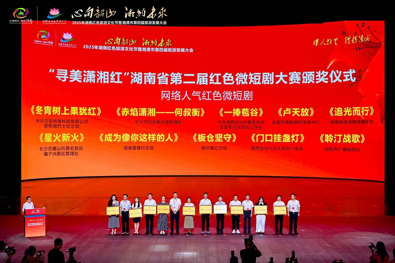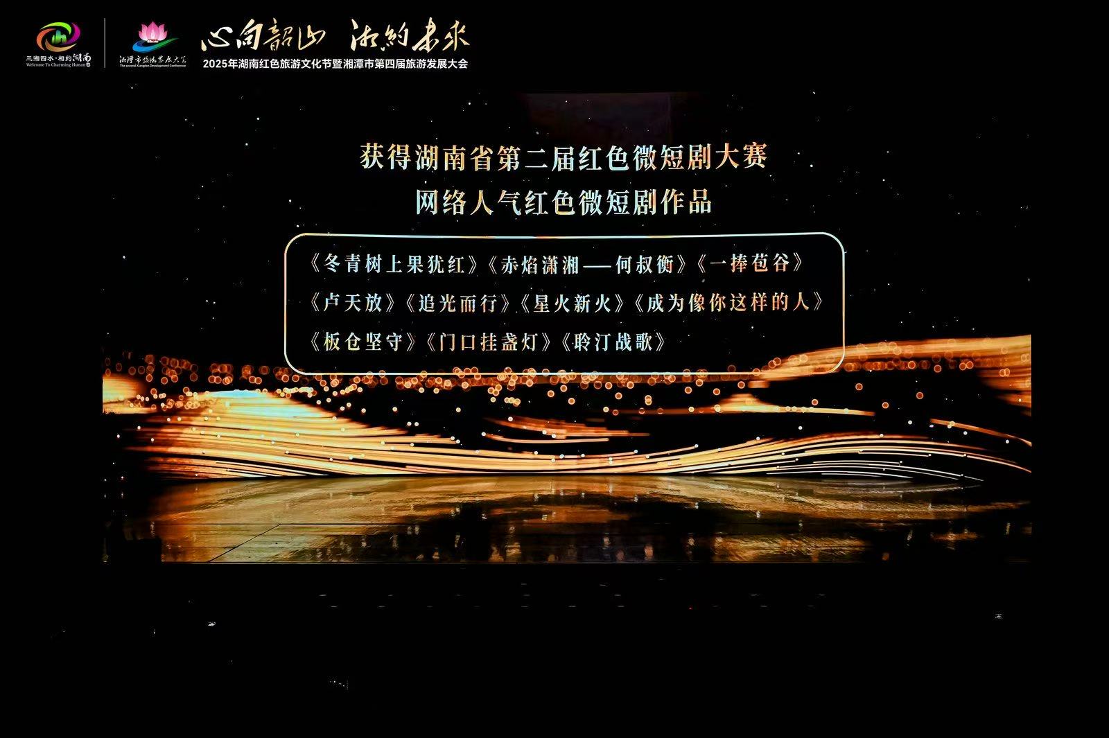 本网讯(通讯员 喻烨)7月11日,2025年湖南红色旅游文化节暨湘潭市第四届旅游发展大会在伟人故里韶山盛大开幕。开幕式上,“寻美潇湘红”湖南省第二届红色微短剧大赛颁奖仪式备受瞩目。永利官网传媒学院2022级学生曹思思、喻烨、何姿英、李曼姝、蒋文芳创作的作品《追光而行》荣获“网络人气红色微短剧”奖,成为全省唯一高校获奖作品。