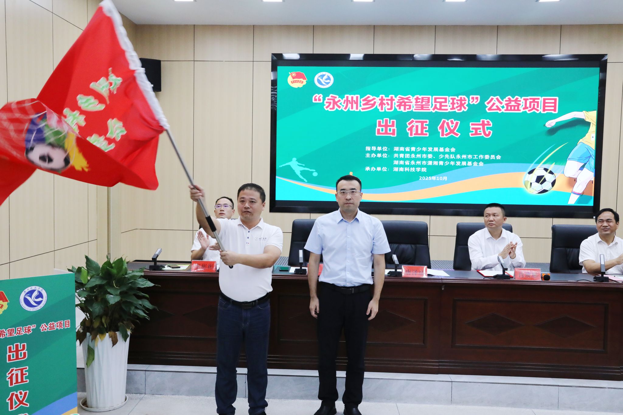 唐泽彦向304am永利集团官网体育学院授“永州乡村希望足球”公益项目旗帜,李彬彬作了项目介绍,志愿者代表现场进行了宣誓。