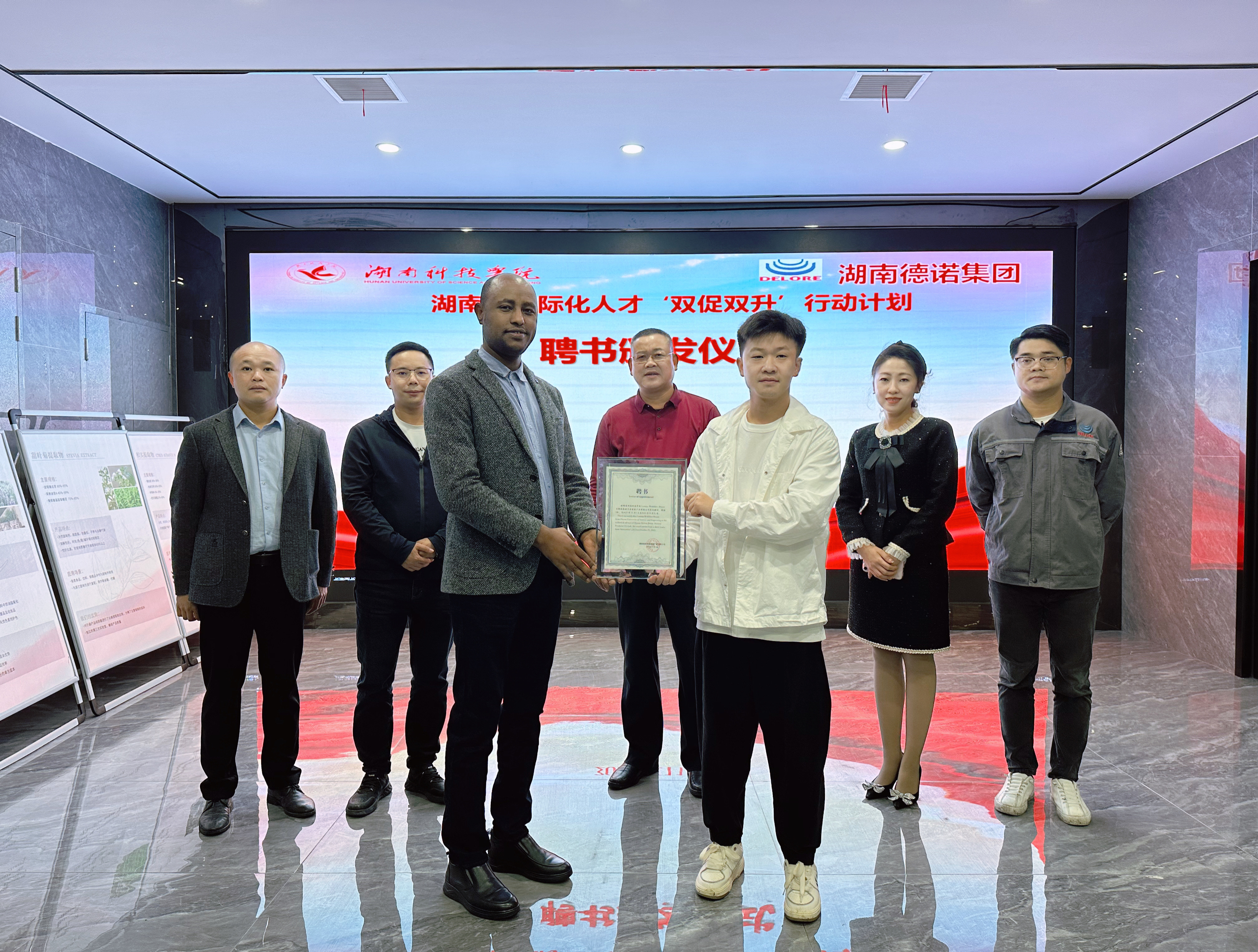 湖南德诺集团聘请校永利官网外国青年专家Wube博士担任该公司的技术顾问,并举行了外国专家聘任仪式。德诺集团总经理刘深根对永利官网为企业提供的科技指导及人才支持表示感谢,希望通过国际化科研人才引进,共促校企合作发展、共赢发展,共同为服务地方经济发展产出更多更好成果。