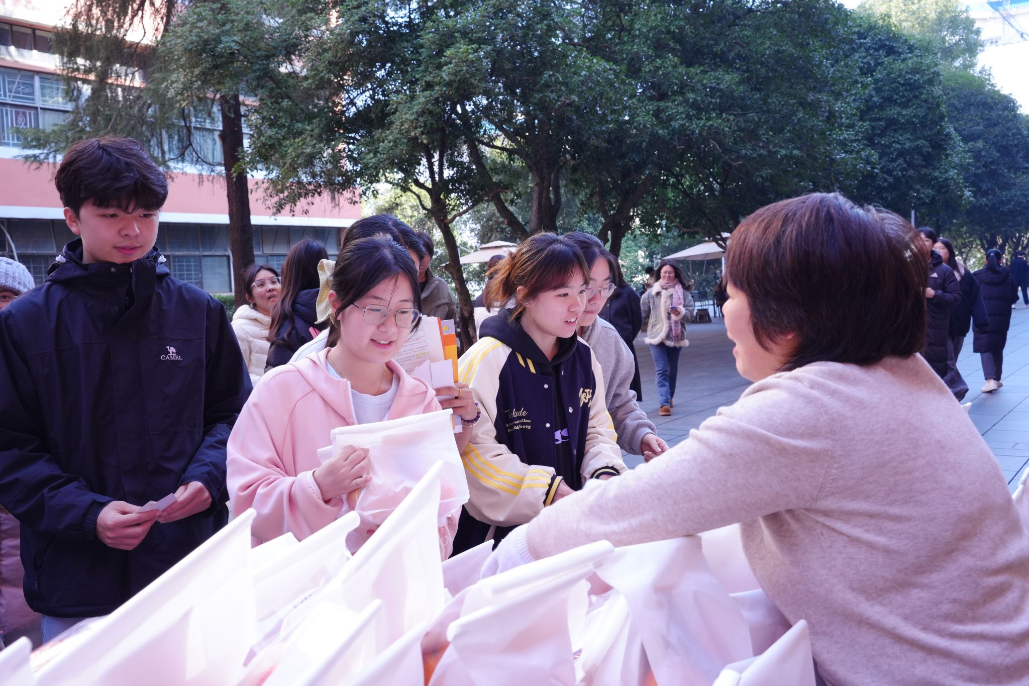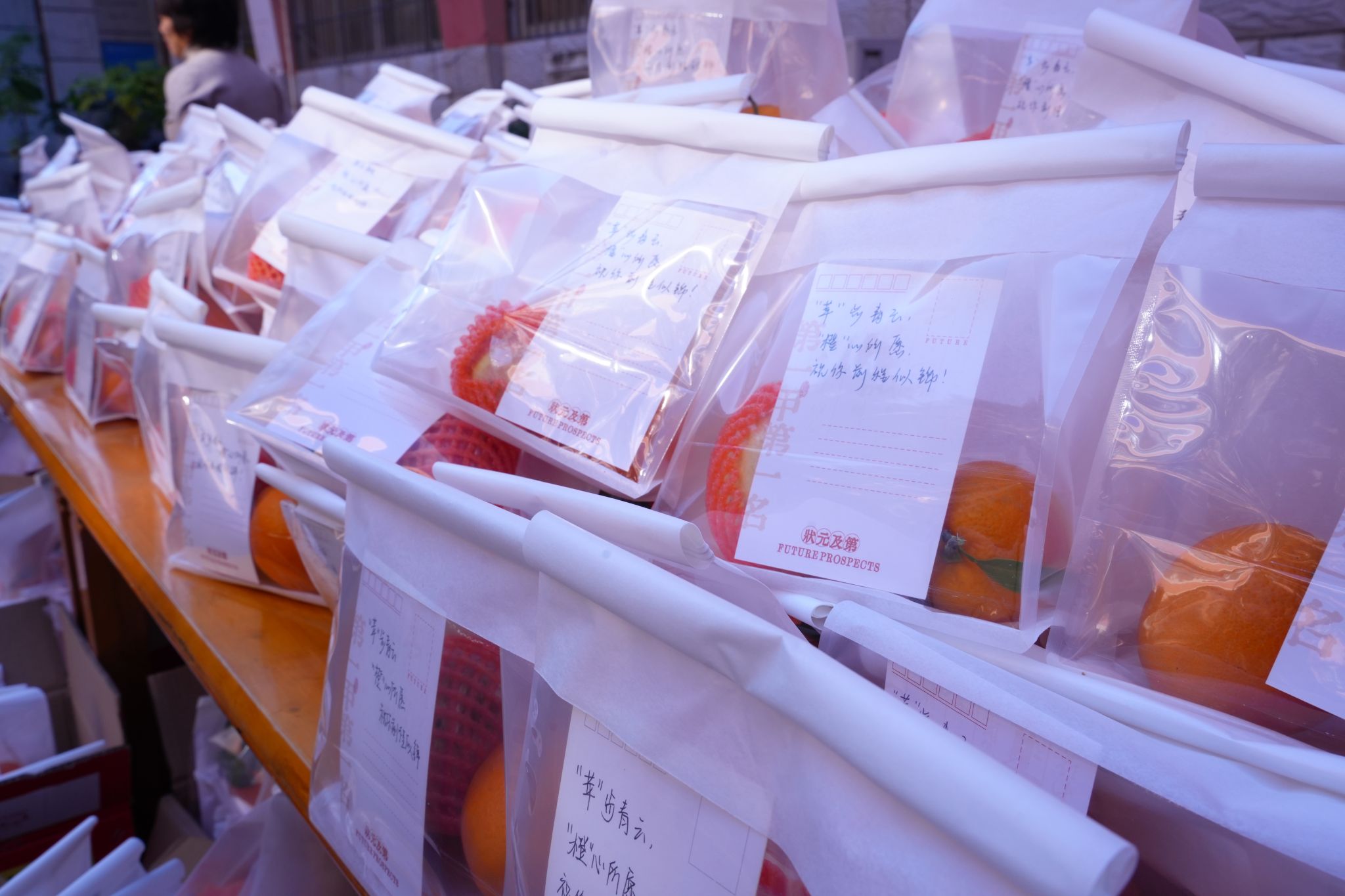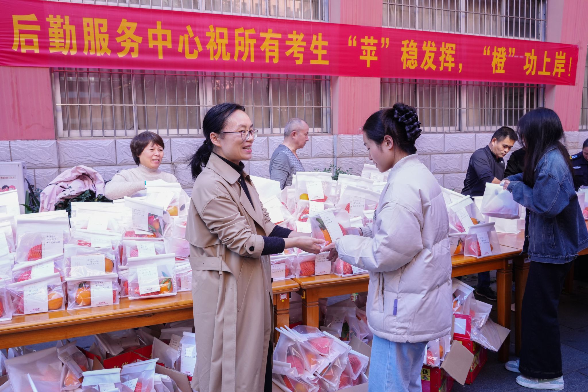 在活动现场,工作人员和志愿者将新鲜的苹果和脐橙提前分装摆放,礼品袋里还贴心放置了手写的祝福文字,“成功上岸”“金榜题名”“马到成功”,一个个充满祝福的词语温暖着考研学子的心。“后勤服务中心的老师们太暖心了,让我们考试更有信心”,现场领取到水果礼袋的一名同学开心之情溢于言表。