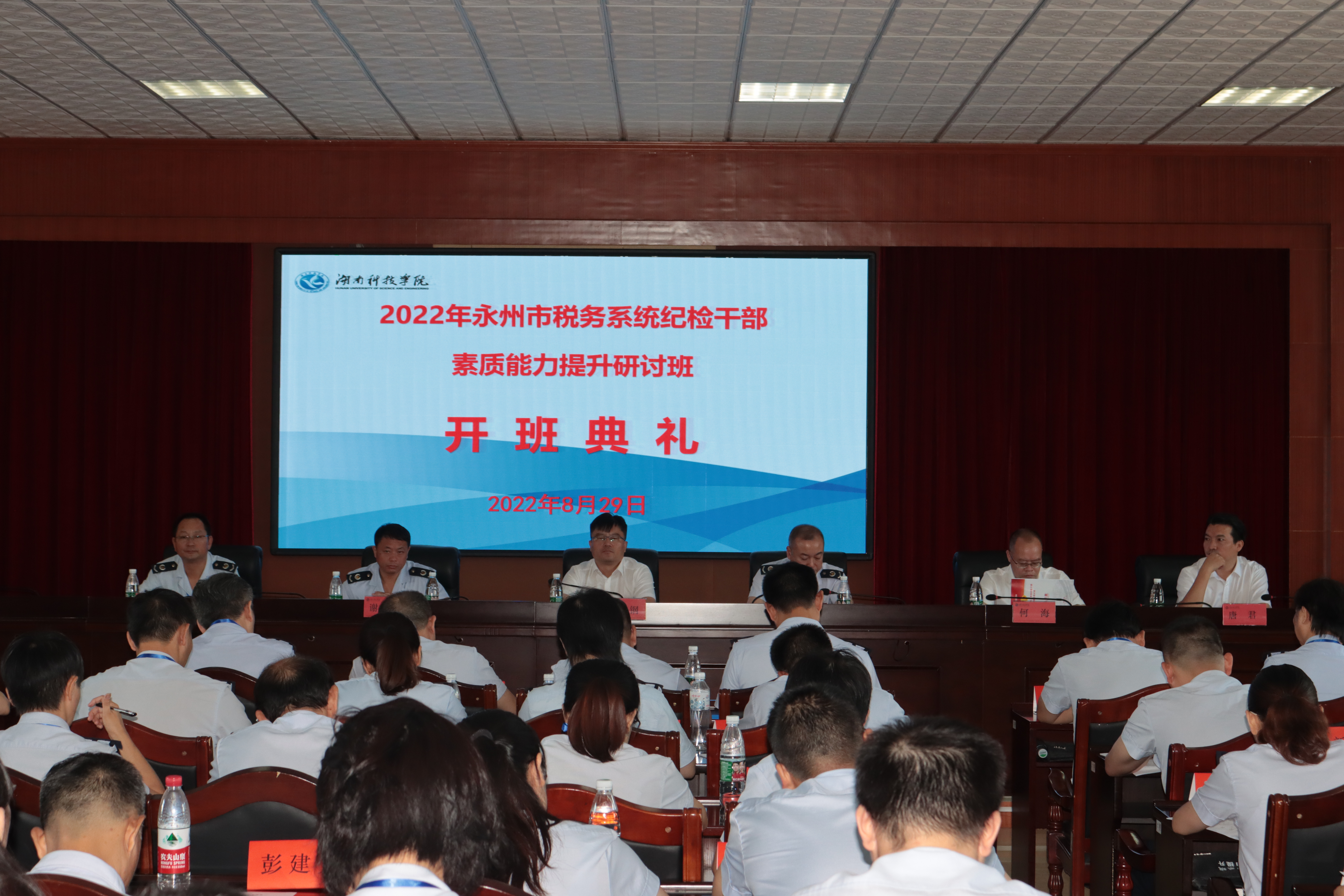 本网讯 8月29日上午,2022年永州市税务系统纪检干部业务素质能力提升培训班开班仪式在永利官网举行,全市税务系统纪检干部代表42人参加了此次培训。校长李钢,党委委员、副校长何海,继续教育学院院长唐君,永州市税务局党委书记、局长邹志伟,党委委员、纪检组组长谢程鹏,常务副组长彭少波,党委办公室主任肖明剑出席了开班仪式。