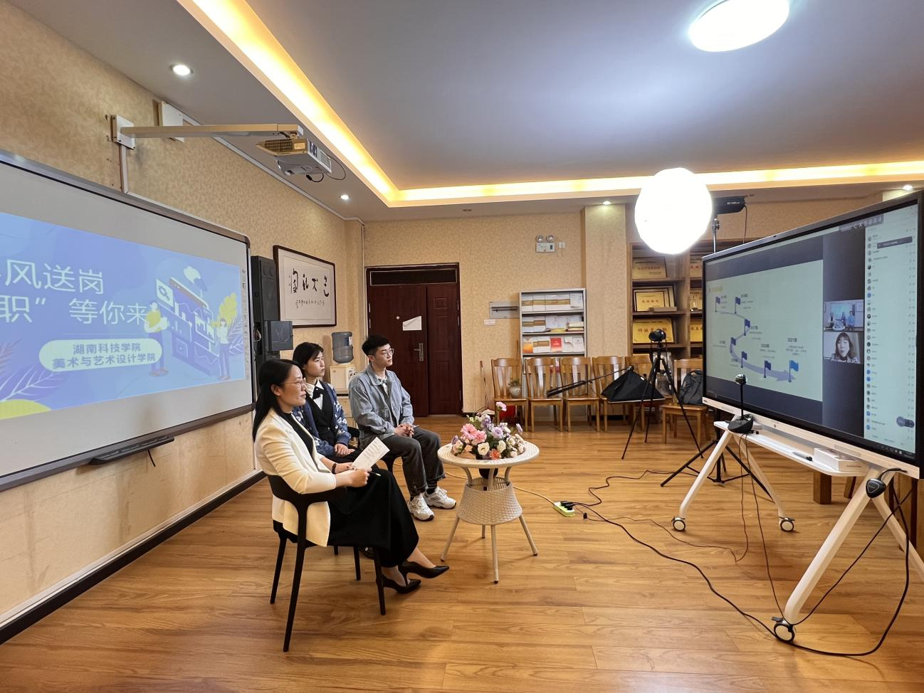 本网讯 4月14日上午,美术与艺术设计学院联合6家优秀校友企业举行“春风送岗·‘职’等你来”线上直播招聘会。本次招聘会现场由美院党总支书记刘华主持,6名毕业生代表参与互动,150余名学生进行线上参与。