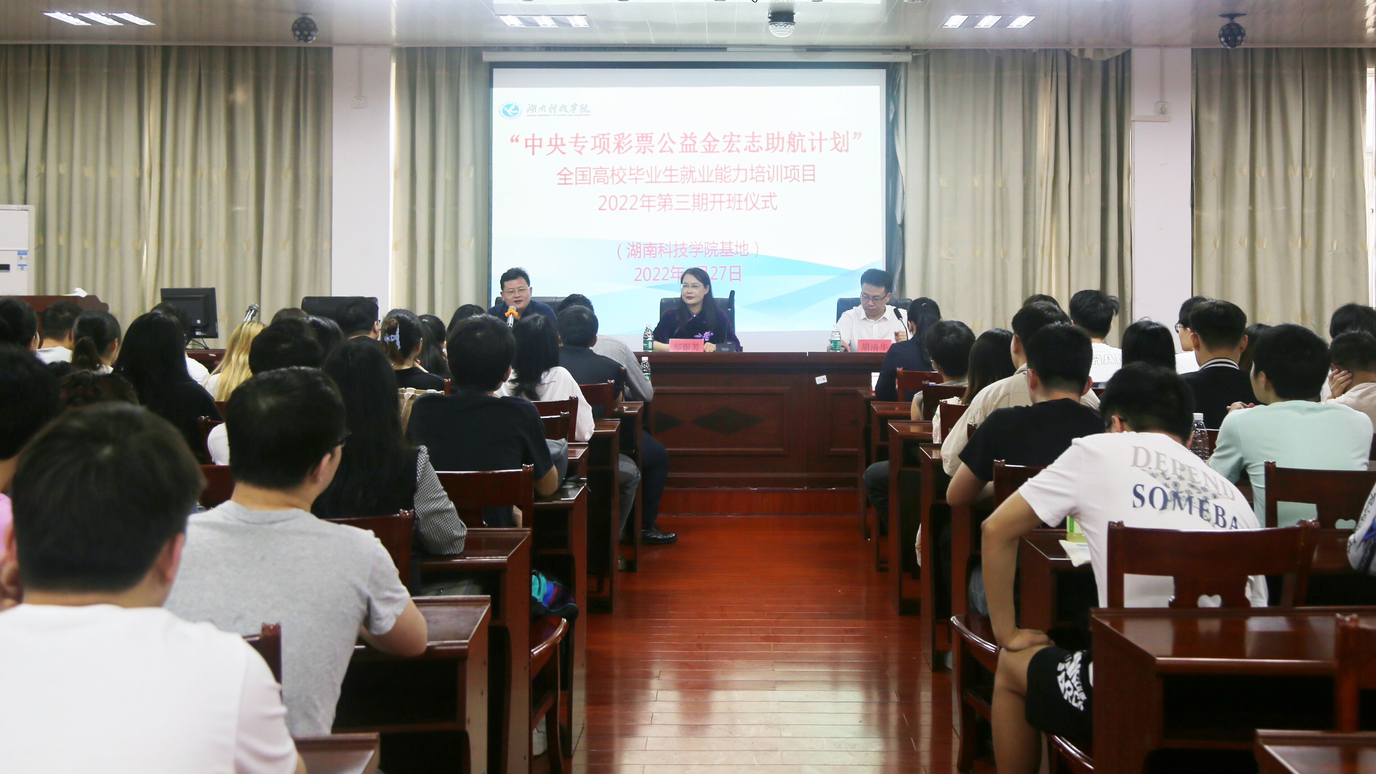 本网讯 4月27日上午,“中央专项彩票公益金宏志助航计划”全国高校毕业生就业能力培训项目304am永利集团官网学院基地2022年第三期开班。副校长郑银芳出席开班仪式并为毕业生授课,理学院党总支书记唐卫华、招生就业处处长(创新创业学院院长)胡清华、理学院党总支副书记欧阳素勤及理学院119名2022届毕业生参加仪式。